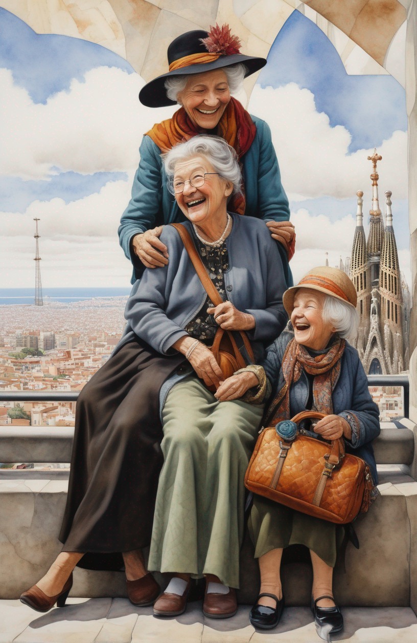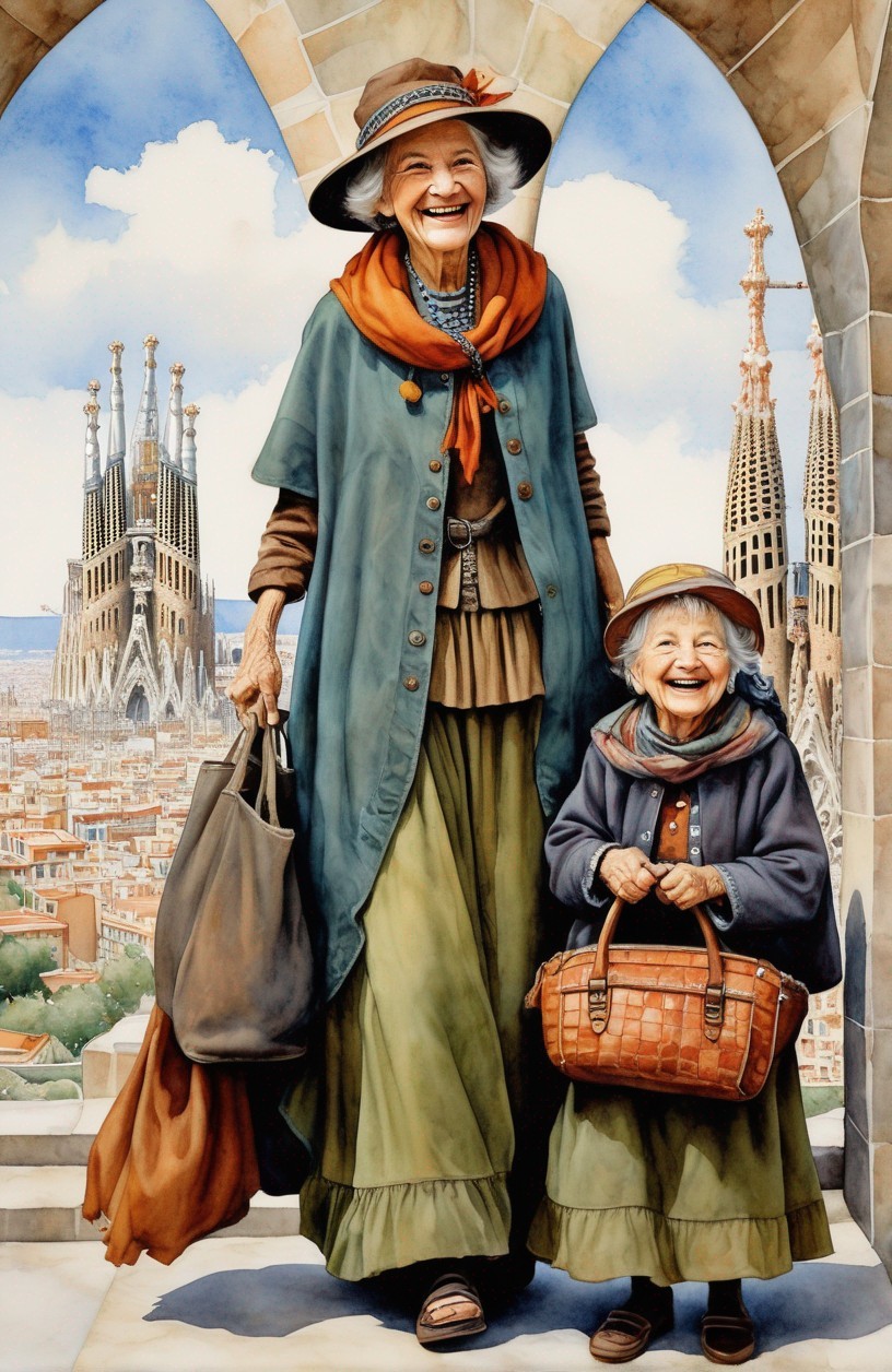Two elderly women laughing joyfully in front of the Sagrada Familia with one holding a basket and the other a bag.