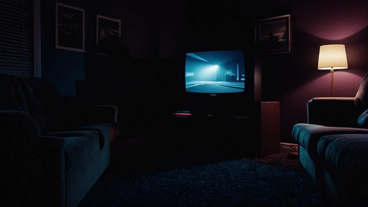 A dimly lit room features a cozy couch and a warm lamp, with a vintage TV glowing blue light, casting an eerie ambiance. Framed photos adorn the dark walls, enhancing the mysterious atmosphere.