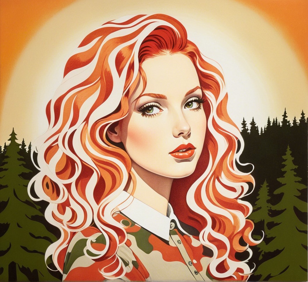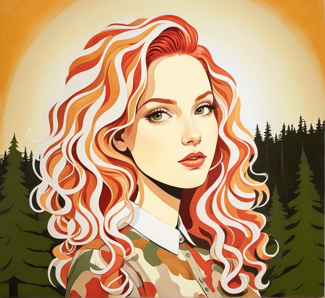 Prompt: Female juvenile face with red curly hairstyle, flowing hair illusion, tessellated, shirt with camouflage pattern, stippled, retrofuturistic, multi-layered style, squiggly gouache painting merged with comic book art. intense flowing hair illusion, romantic abstraction by Frank Fazetta, dyed, tints of 1970s advertising art, frantically baroque, 135mm photography style, high coloring, warm tones, cel-shaded, sculpted, line-art features. Background: Stylized landscape featuring a forest of slender fyr and pine trees with exaggerated trunks, deeply textured ochre bark and detailed dark green leaves, sunlight transitioning from beige to auburn, darkened transitions from pale beige at the top to lighter ochre shades closer to the edges, gradient color inking, calmness, natural beauty: dusk, golden ratio, divisionism, tranquility, soft coloring, visible horizon, dimmed, style of Henri Rousseau, John buscema, barclay shaw, gradient inking colors, tessellated, geometrical, symmetrical, wavery textures, thickened gouache brushstrokes, dappled lighting, triadic color scheme beige red green, 3 layers of dof, simplified lineage details, cel-shaded, dethereal, beautiful marvel heroine with high temples and curly tousled hair, modern cheerful surrealism, line-art details, high detail, plasticity 1.6,