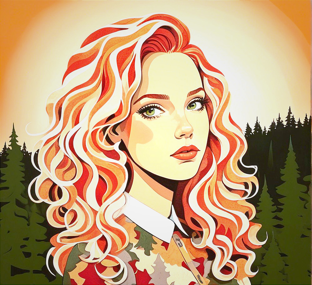 + Prompt:Female juvenile face with red curlyhairstyle, flowing hair illusion, tessellated, multi-layered style, squiggly gouache painting merged with comic book art.Background: Stylized landscape featuring a forest of slender fyr and pine trees with exaggerated trunks, deeply textured ochre bark and detailed dark green leaves, standing tall on a grassy meadow,sky transitions from pale blue at the top to lighter ochre shades closer to the edges, calmness, natural beauty: dusk, golden ratio, divisionism, tranquility, soft coloring, visible horizon,dimmed, style of Henri Rousseau, John buscema, barclay shaw, gradient inking colors, tessellated, geometrical, symmetrical, wavery textures, thickened gouache brushstrokes, dappled lighting, triadic color scheme beige red green, 3 layers of dof, simplified lineage details, cel-shaded, dethereal, beautiful marvel heroine with high temples and curly tousled hair, intense flowing hair illusion, romantic abstraction by Frank Fazetta, hues, tints of 1970s advertising art, frantically baroque,