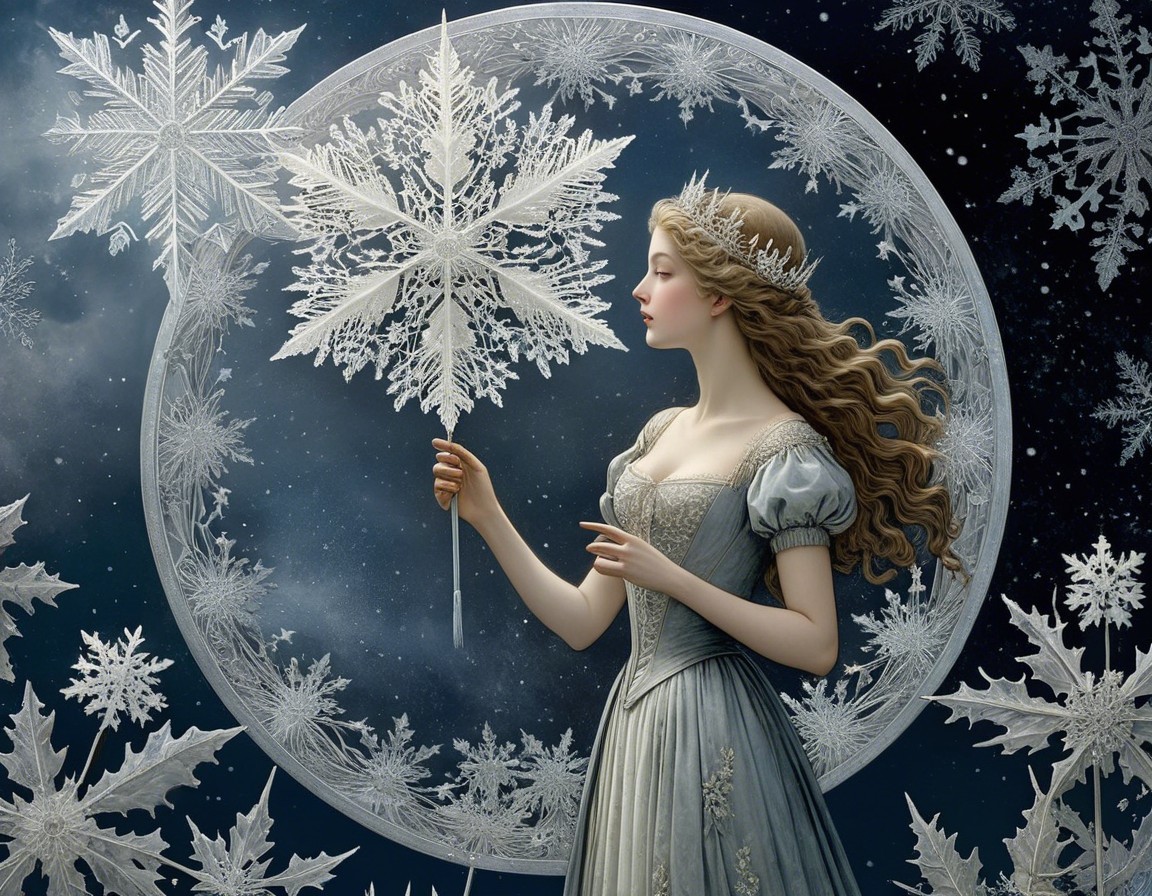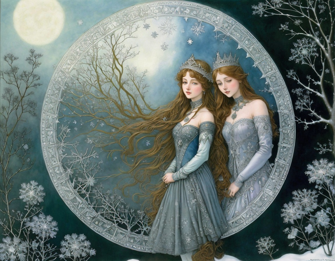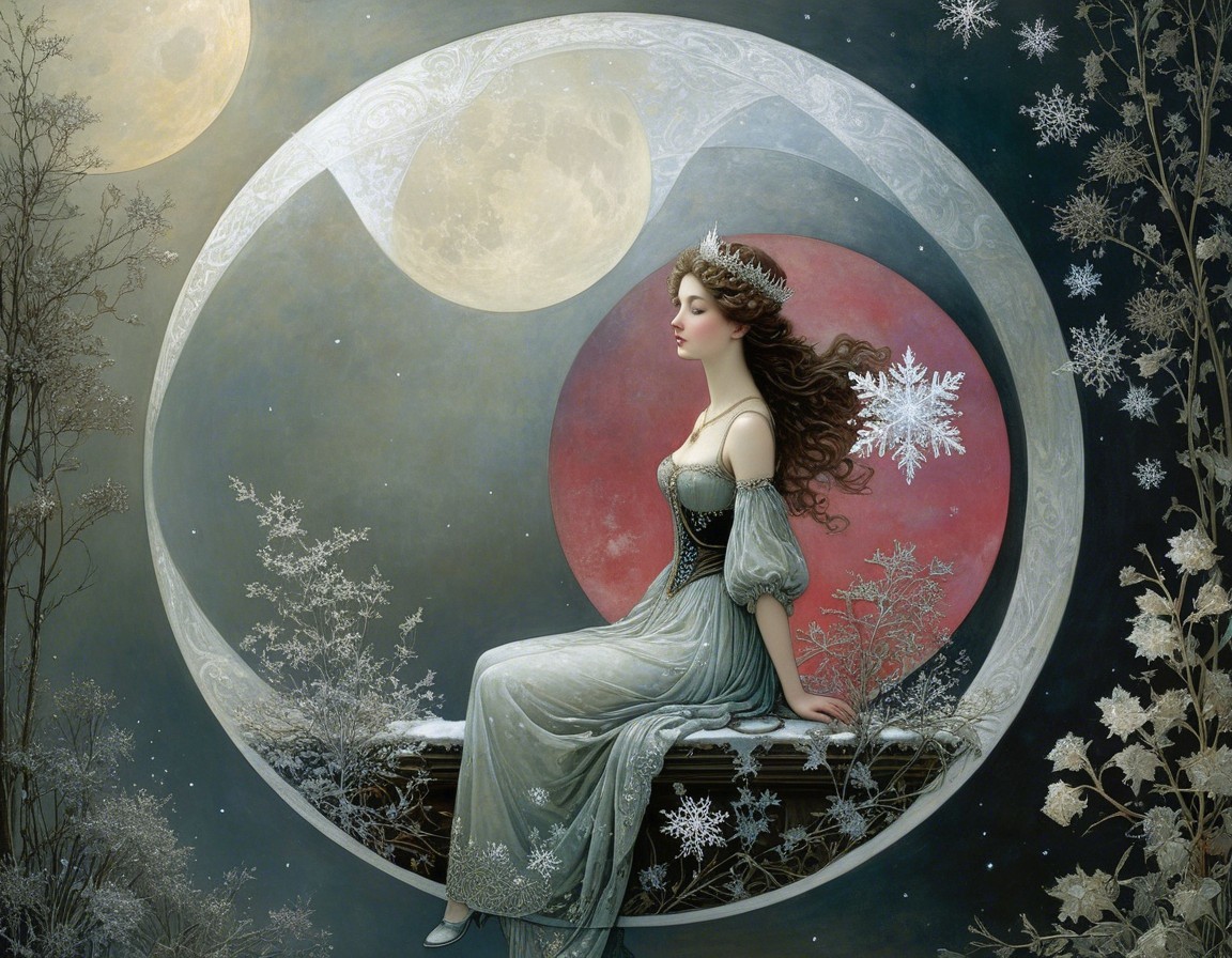 A serene woman with golden accents in her hair stands amidst a snowy landscape, under a full moon. Delicate trees surround her, enhancing the magical winter atmosphere.