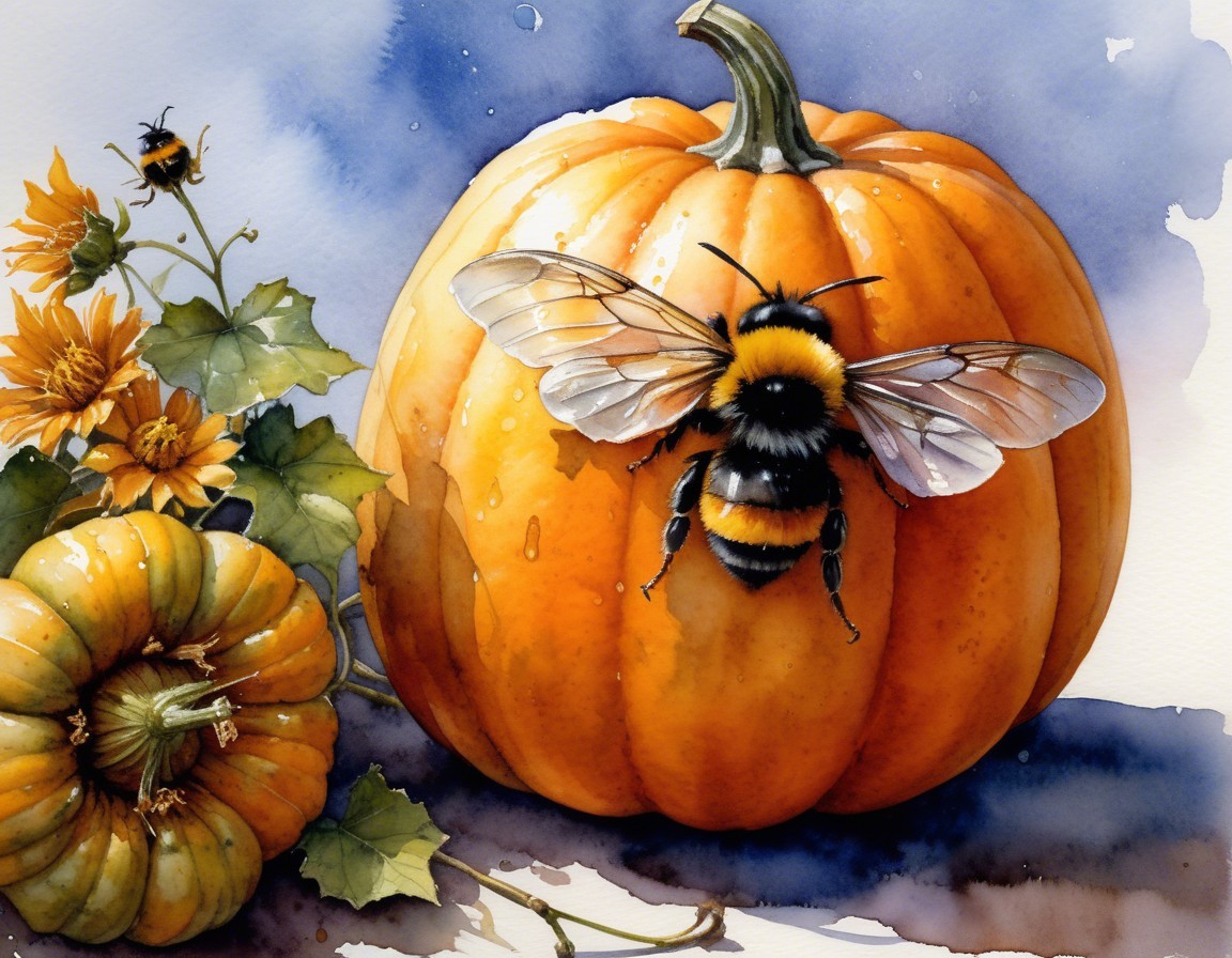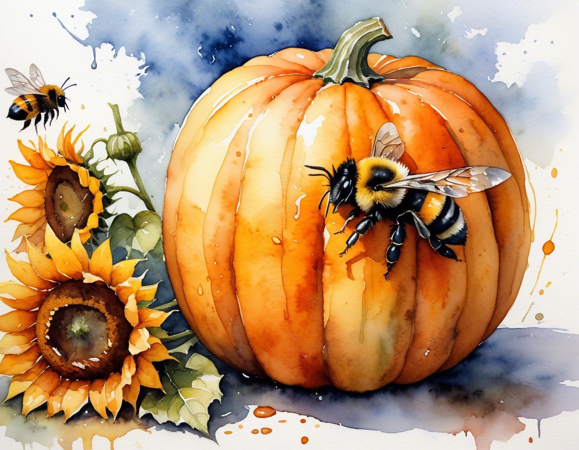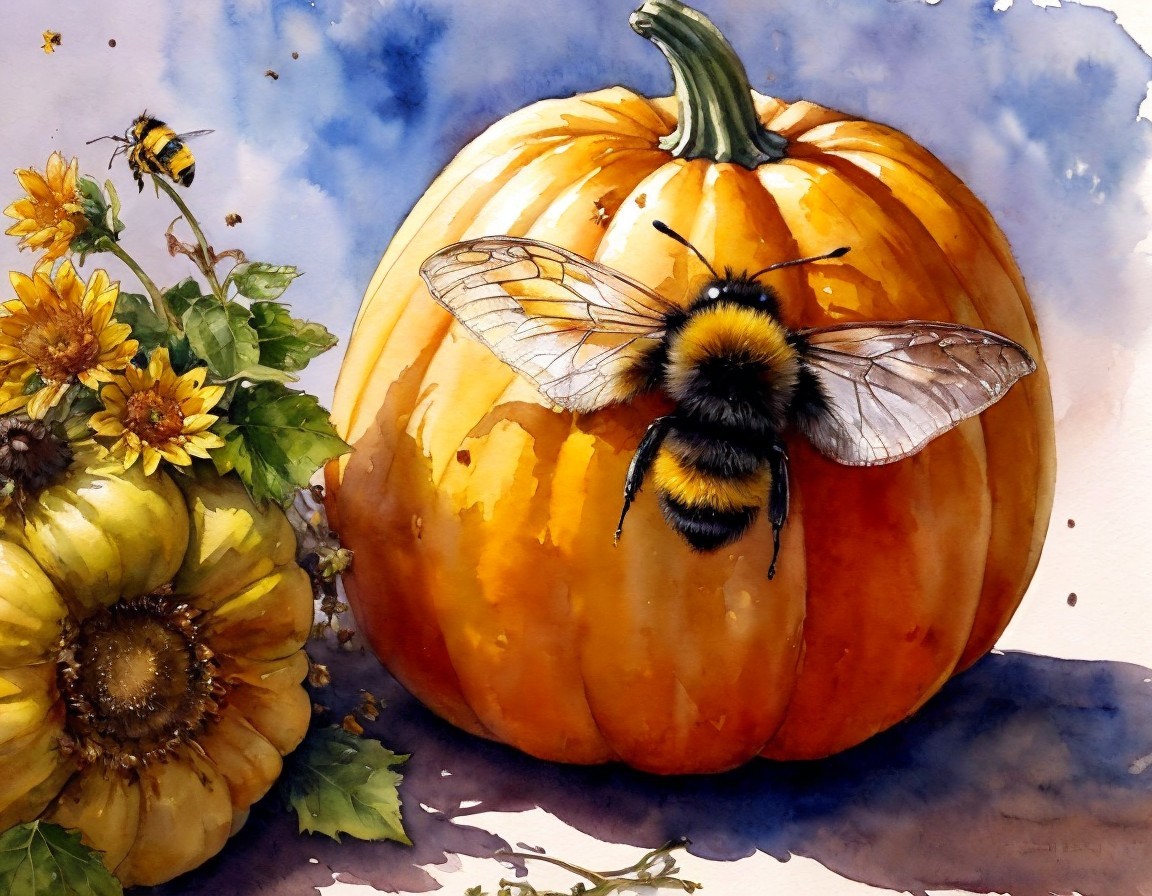 A vibrant watercolor illustration features a bright orange pumpkin, adorned with bees and surrounded by sunflowers, capturing the essence of autumn and nature's beauty.