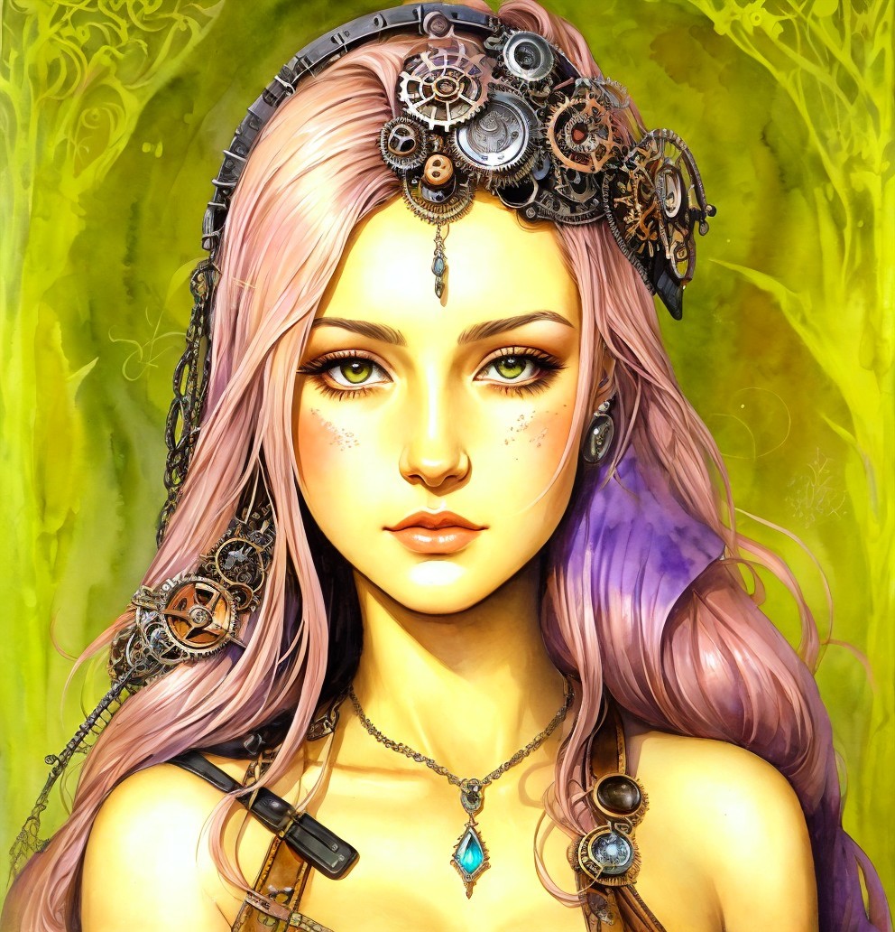 Stylized Steampunk Portraiture of teenage temptress drawn with watercolour and ballpen, dynamic lighting 1.7, blotting quill pen, style of Overton Loyd, Florianne Becker, Aaron Horkey, Lin Fengmian, John Reuss, Jean-Sebastien Rossbach, Marianne Stokes, Justin Gaffrey, John Lowrie Morrison, Patty Maher merged with70ies adult franco-belgian comic art style, ballsy strokes, strict line, eerie, colored with colourful aquarelle, grain, hues, stylized comic art, coherent, brightness 1.9, layered, Figurative, romantic, back-lit, delicate coloring, abstract, intricate, geometrical, gorgeous, tetradic color scheme Emerald pink green beige, beautiful composition, synthetic, heretic, sumptuous, extremely intricate fine lines, filigrane tiny lines, quilling, quaint, folded paper style, cel-shaded, golden ratio, high coloring, brushed textures 1.7, ambient occlusion 1.5, anisotropic filtering 1.7, raytraced shadows 1.8, sublime, brightness 1.4, tetradic color scheme purple pink lilac light-green, stacked-up perspective 1.9, comical sketch art, geometrical features, octane render illustration, dreamscape, Fantasy art, gothic background, Beautiful portrait sculpture of a female face, style of 1970s fantasy art, metallic colour, geometrical illustrative style merged with storybook illustration, triadic color scheme pink beige purple, soft pastel colors, watercolors and ink, beautiful, intricate, crisp quality, limited pallet, abstract, maximalism brightness 1.4, 8k, devilish eyes 1.7, american gothic 1.7, plasticity 1.9, juvenile, glossy, soft rounded edges, muted limited pallet, vaporous lighting, plasticity 1.6, complexion 1.4,, dew drops accents, natural nose and lips, long straight curly hair, elaborate patterned silhouettes, soft-focused,  stacked-up  view. Surreal stylized, hues,