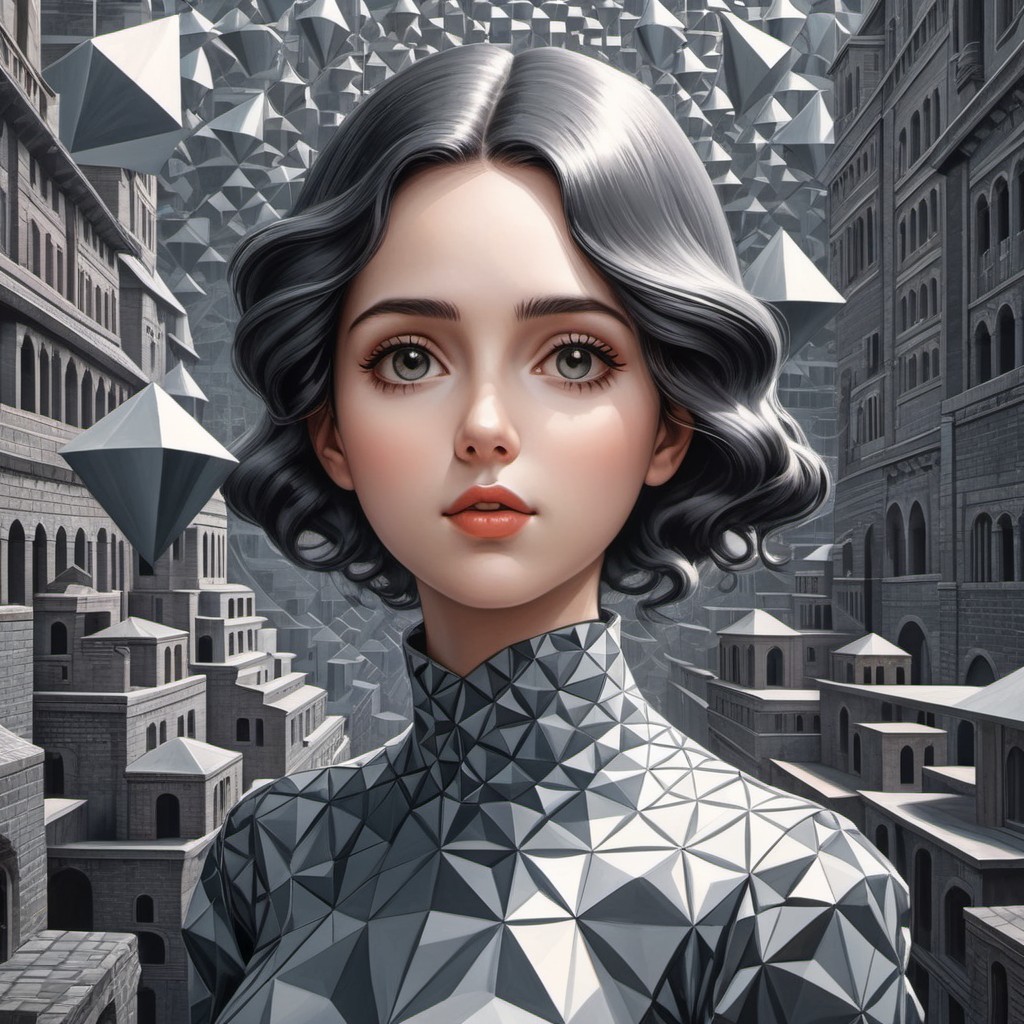 CG illustration: Girl with large eyes and silver polygon skin in Escher-esque setting