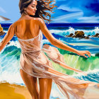 A woman in a flowing white dress walks gracefully along a vibrant beach, with striking waves and a bright blue sky in the background, capturing a sense of freedom and beauty in nature.