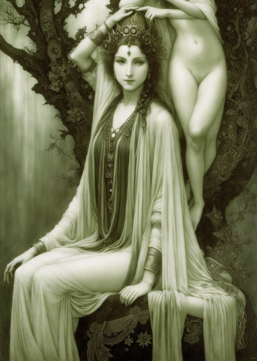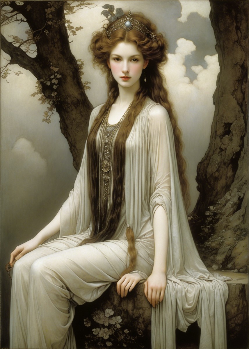 A stunning young woman with flowing red hair and braided locks, draped in a sheer white garment, poses elegantly beside a large, intricate clockwork mechanism against a dreamy sky backdrop.
