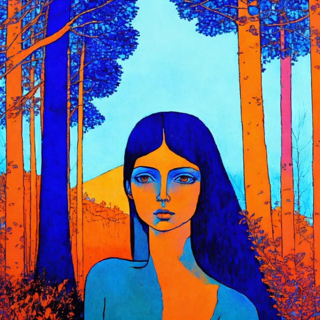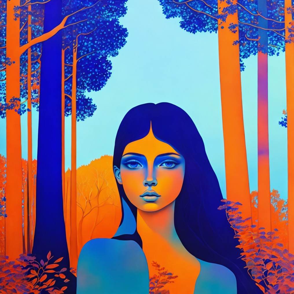 A mesmerizing portrait of a radiant figure standing amidst a grove of strikingly vibrant blue and orange trees. Her ethereal glow and serene expression reflect harmony with the surreal environment, blending luminosity and nature’s bold palette.