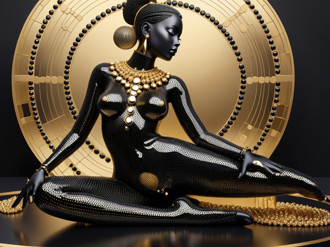 A striking figure adorned in black and gold, with intricate beadwork and jewelry, poses gracefully against a circular golden backdrop, exuding elegance and sophistication.