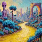Surreal Landscape with Vibrant Nature and Alien Figure
