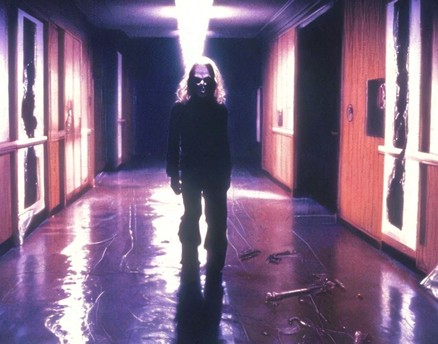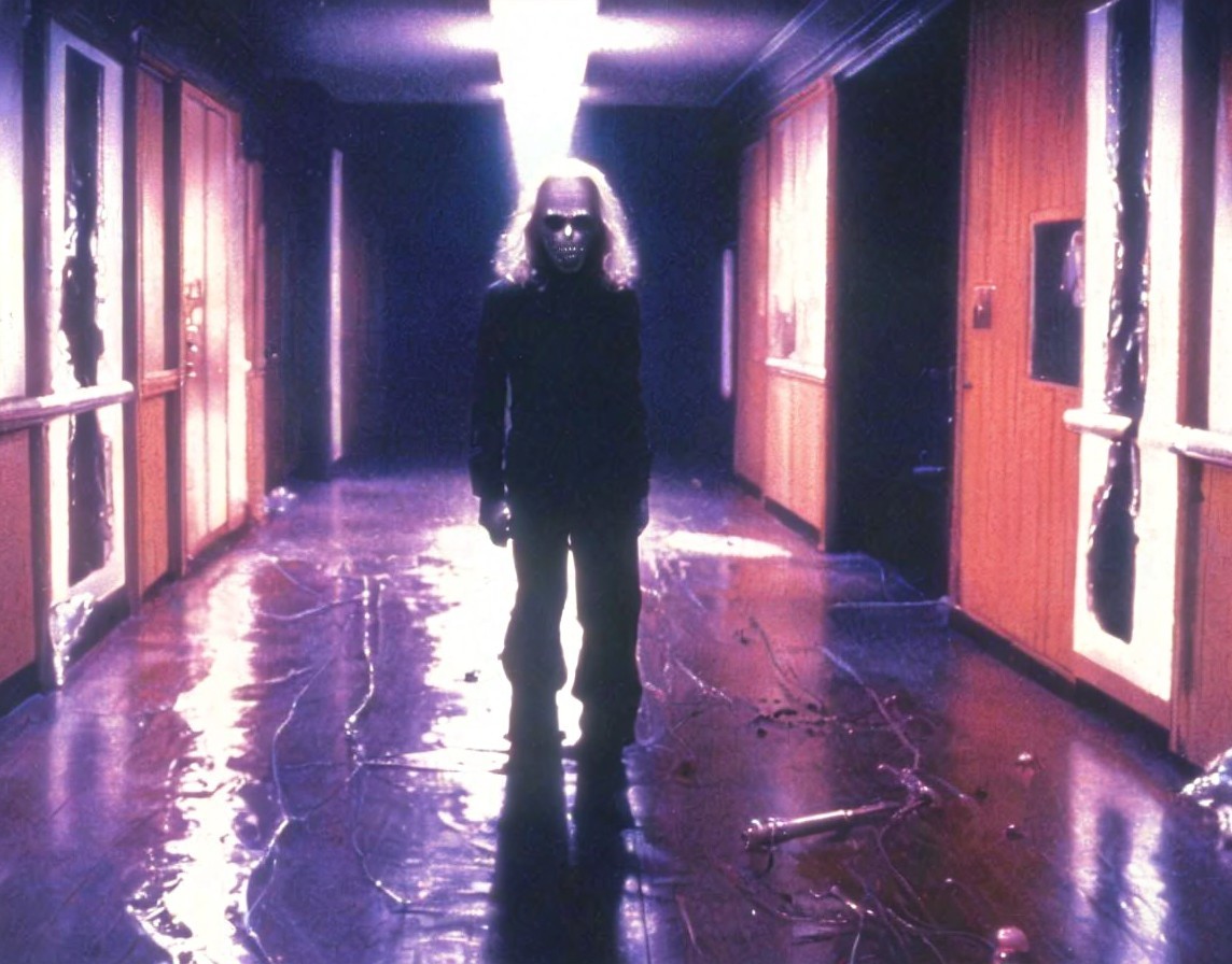 Dimly Lit Hallway with Ominous Figure and Glossy Floors