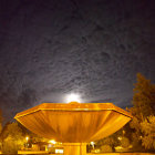 A majestic fountain glows under a full moon in a serene park. Surrounding trees and soft lighting create a tranquil atmosphere, while dramatic clouds add to the enchanting night scene.