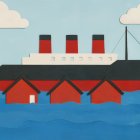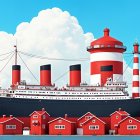 A colorful, paper-cut-style illustration features a vintage steamship with three smokestacks sailing through stylized waves, surrounded by red-roofed houses and fluffy clouds.