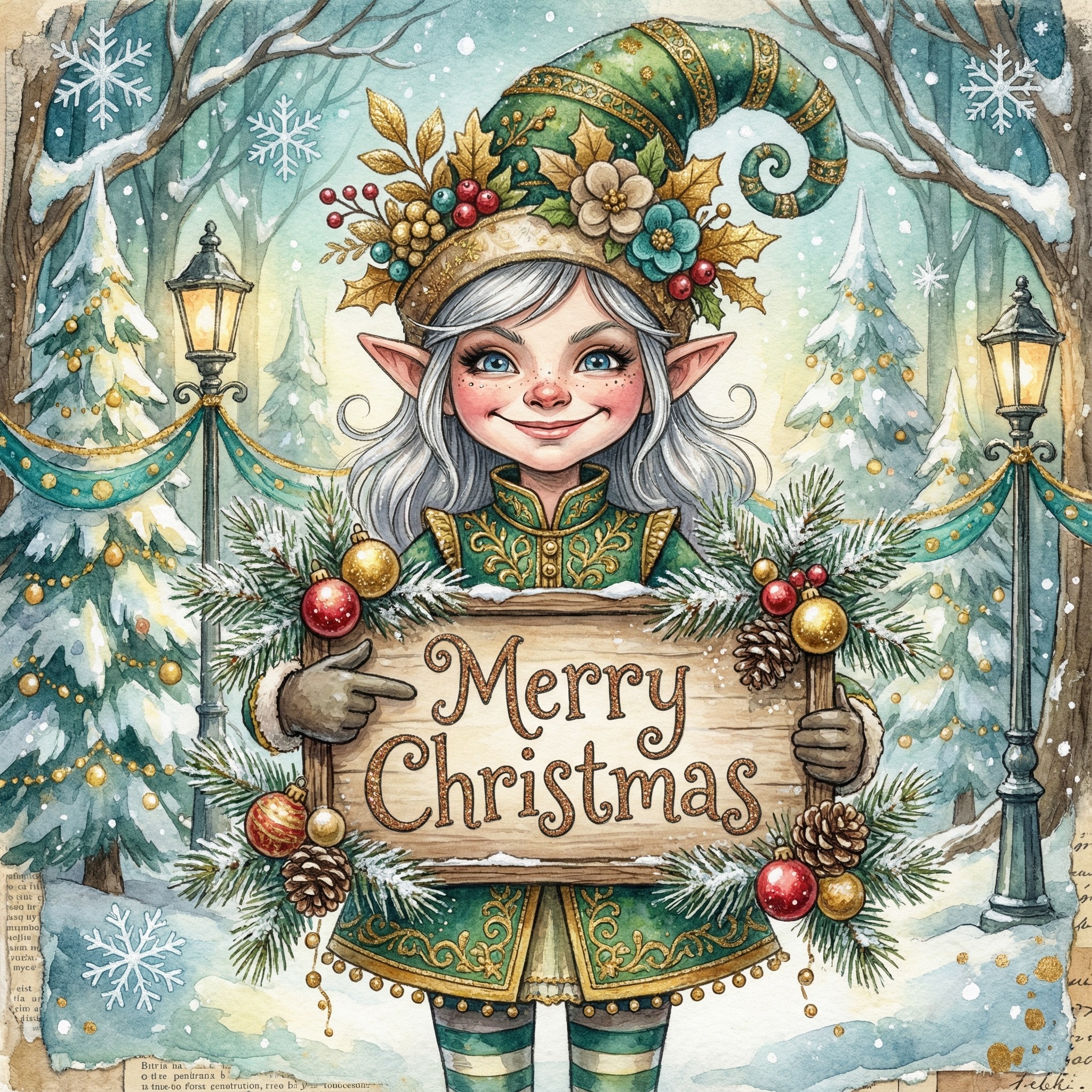 A whimsical mixed media scene depicts a silver-haired elf girl in an enchanted snowy forest. Dressed in ornate green and gold, she smiles with feigned joy while holding a "Merry Christmas" sign. The backdrop features snow-covered trees and teal-gold decorations, creating a magical, storybook charm with soft snowfall.