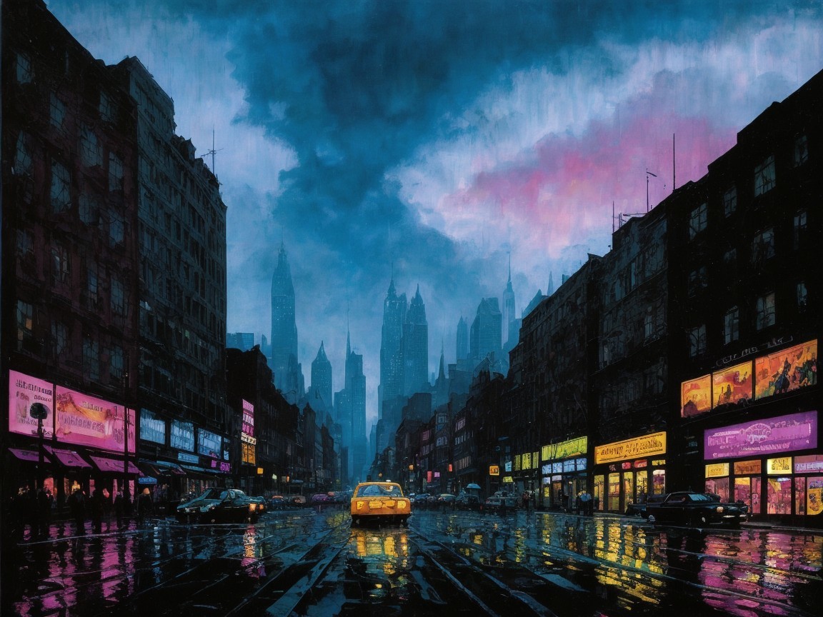 Prompt: "A classic car navigates a rainy city street at dusk, surrounded by towering buildings silhouetted against a vibrant, colorful sky. Streetlights glow softly in the wet atmosphere. Spectrum Magazine, Graphic Novel surrealistic Comic Art by Bill Sienkiewicz, Francis Bacon, Marc Chagall, Ben Templesmith, Dave McKean, Zdzisław Beksiński, Brom, A bustling city street at dusk, illuminated by the headlights of numerous cars traveling in both directions. The road reflects golden hues from the setting sun and the artificial lights, creating a warm ambiance. On either side of the street, dark silhouettes of trees with bare branches frame the scene, enhancing the urban feel. Tall buildings stand in the background, some with glass facades that catch the fading light, while others display bright signage. The sky transitions from orange to deep blue, hinting at twilight. The overall atmosphere is dynamic and lively, capturing the essence of city life."