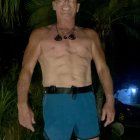 The image features a muscular man posing confidently in blue shorts. He stands against a dark, abstract cityscape backdrop, emphasizing his physique and striking expression.