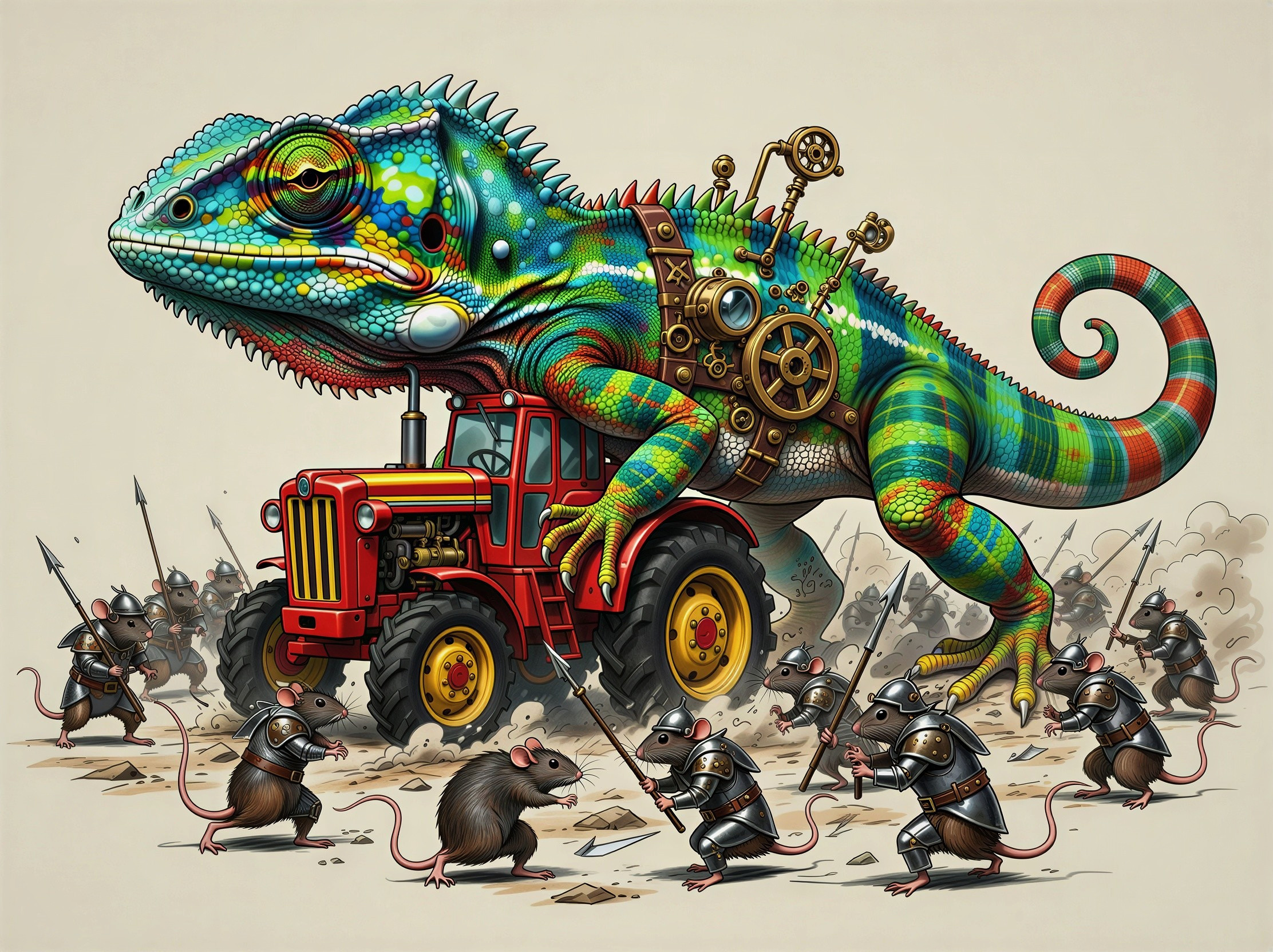 A vibrant chameleon lizard with a steampunk harness mounted on its back is walking over a red tractor, with dozens of armored mice carrying spears walking in front of it.