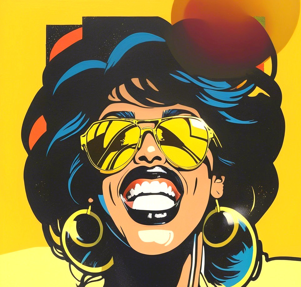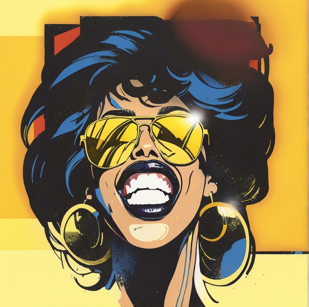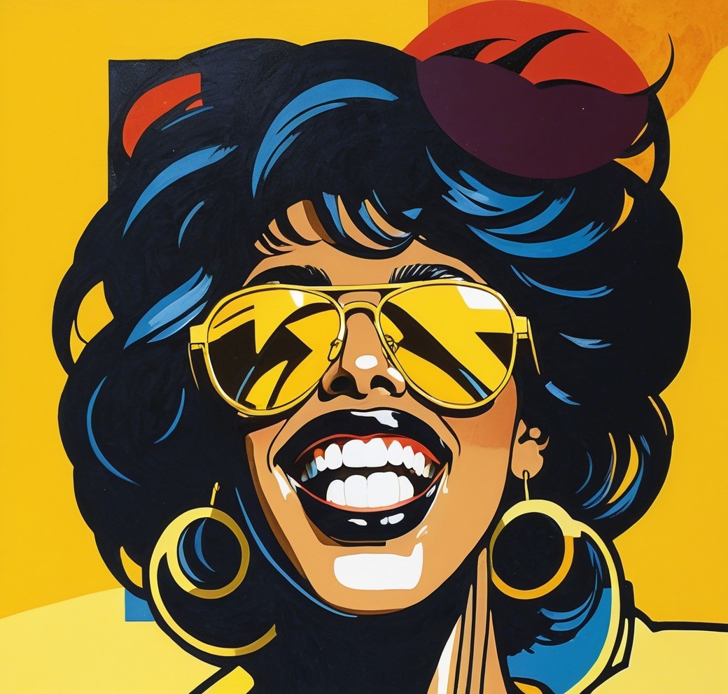 A vibrant illustration of a smiling individual with bold blue hair, oversized yellow sunglasses, and large hoop earrings, set against a bright yellow backdrop, exuding joy and energy.