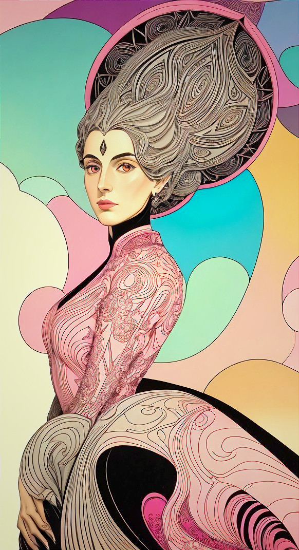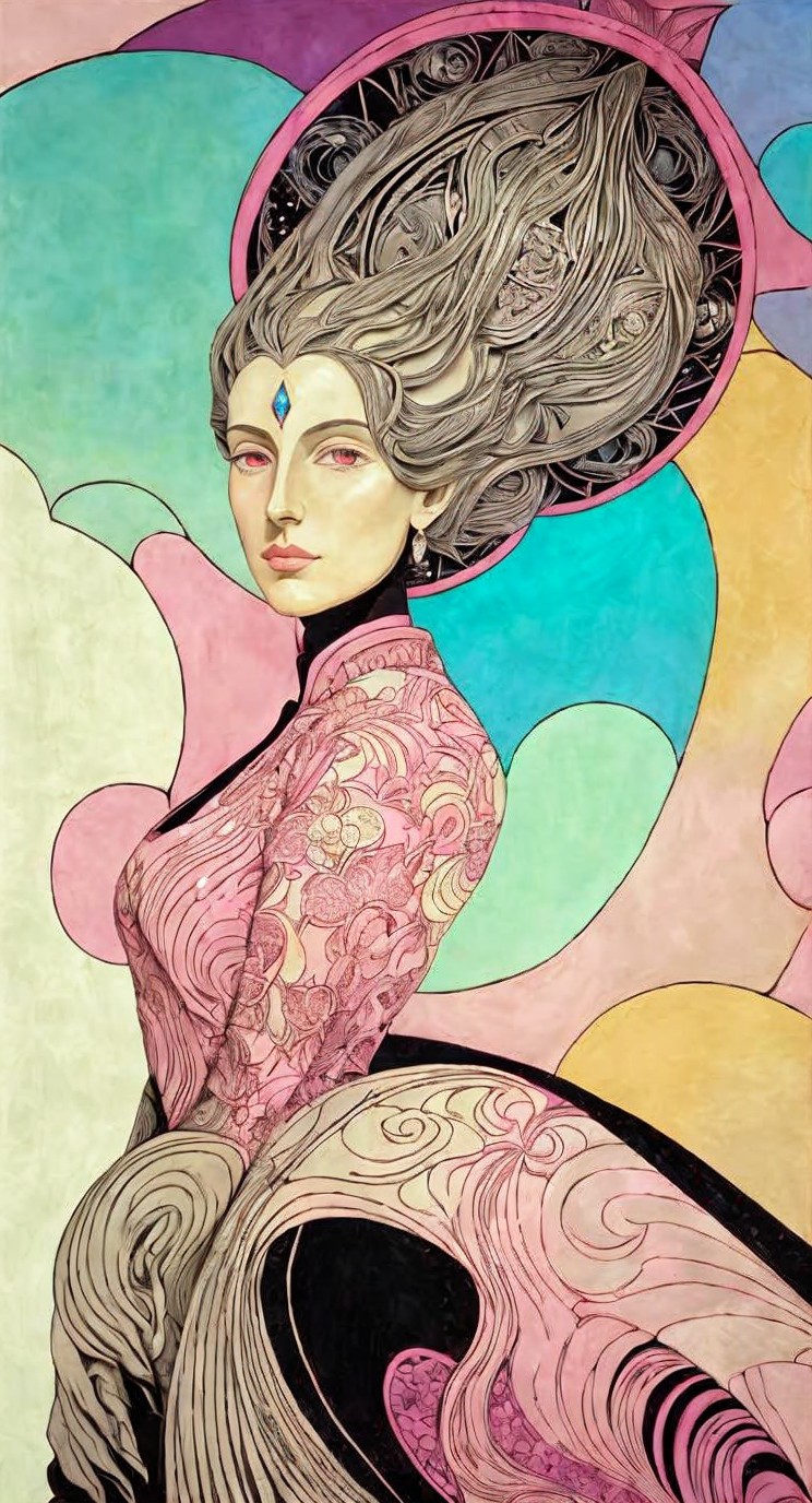 fantasy portraiture, style of Leonora Carrington ,stylized Woodblock print, tints of 3d linocut, upper body portrait of beautiful superheroine, wide-angle perspective, stacked lines, (triadic color scheme grey beige pink, tints of zentangle art), perfect handsface, cel-shaded, 7:5) tints of space age art, brightness 1.9, layered geometrical vector art, Art Nouveau portraiture, stylized Woodblock print, detailed lineage forms female head, headshot style. Zentangle lines form detailed female head, triadic color scheme pink white black, embossed with cracks, crackles, high coloring 1.9, tints of 1970s advertising art, 3d art, Synthetic essence, tints of geometrical art, subsurface scattering 1.7, back-lit, effects 1.8, streamline_moderne, anisotropic filtering 1.7, intricate details, shadow mapping 1.8, dynamic lighting 1.7, fine strokes, maximalism, radiance, illustrative style, radiance, maximalism, plasticity 1.6, complexion,, octane render, bright, back-lit, illustrative stylization 1.6, hues, highly chipped peeling, dynamic lighting 1.7, high coloring 1.4, soft edges, light hues, highly chipped background, dynamic lighting 1.7, ambient occlusion 1.5, anisotropic filtering 1.7, luminous, saturated colors 1.5, geometrical, stacked lines, intricate details of lineage, raytraced shadows 1.8, sublime, mood, occult, brightness 1.9, vaporwave 1.7