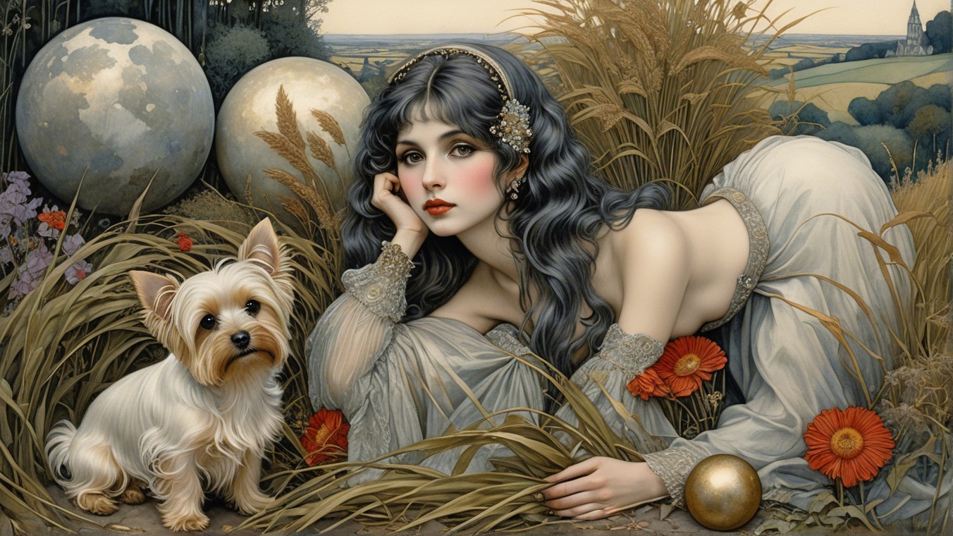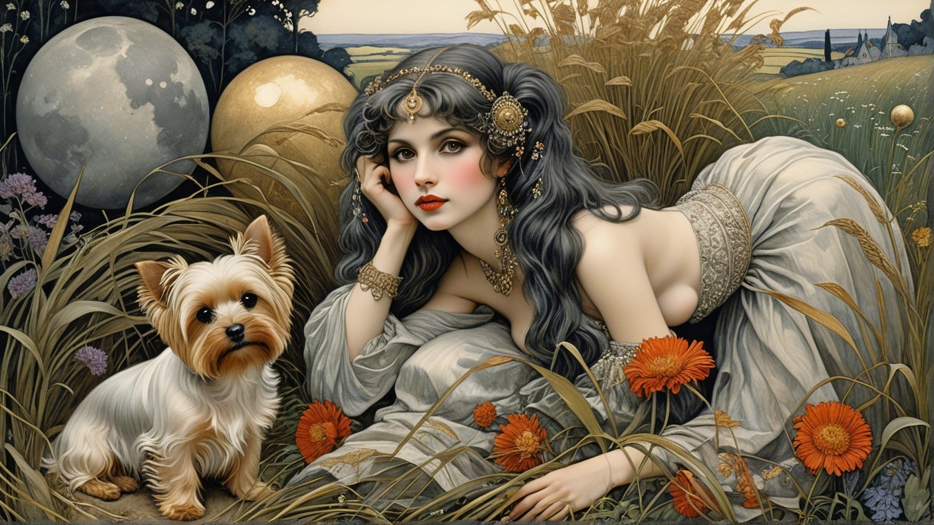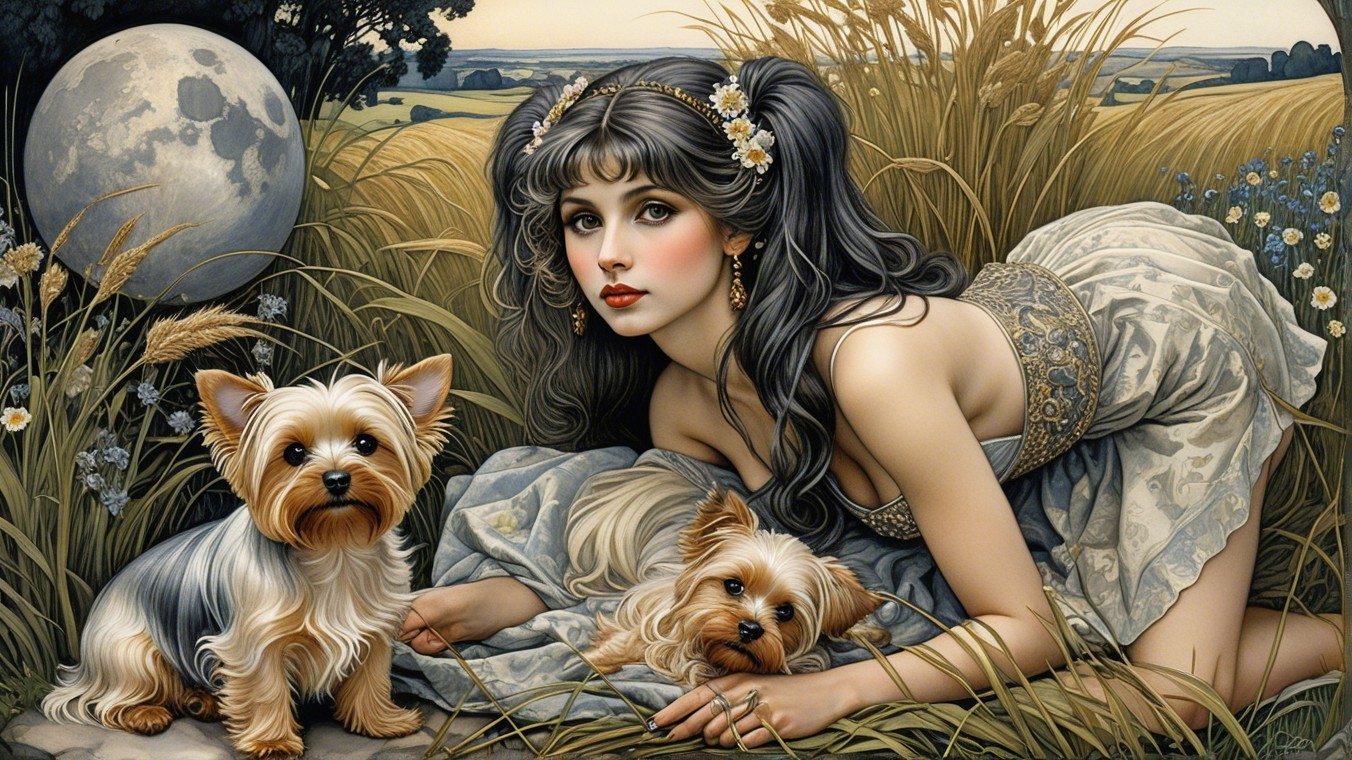 A young woman with long, dark hair adorned with flowers lies in a grassy field alongside two Yorkshire Terriers. A full moon glows in the background, surrounded by a serene landscape.