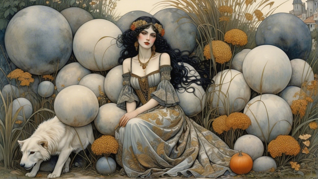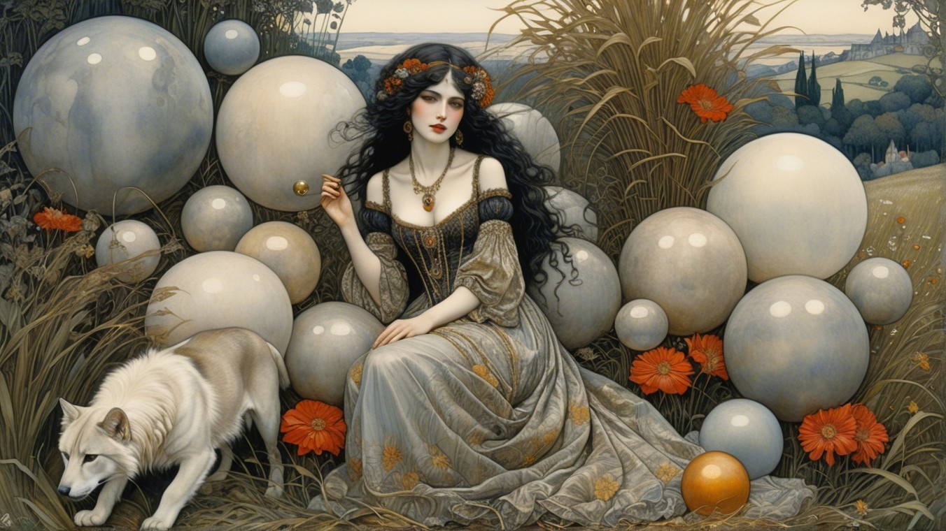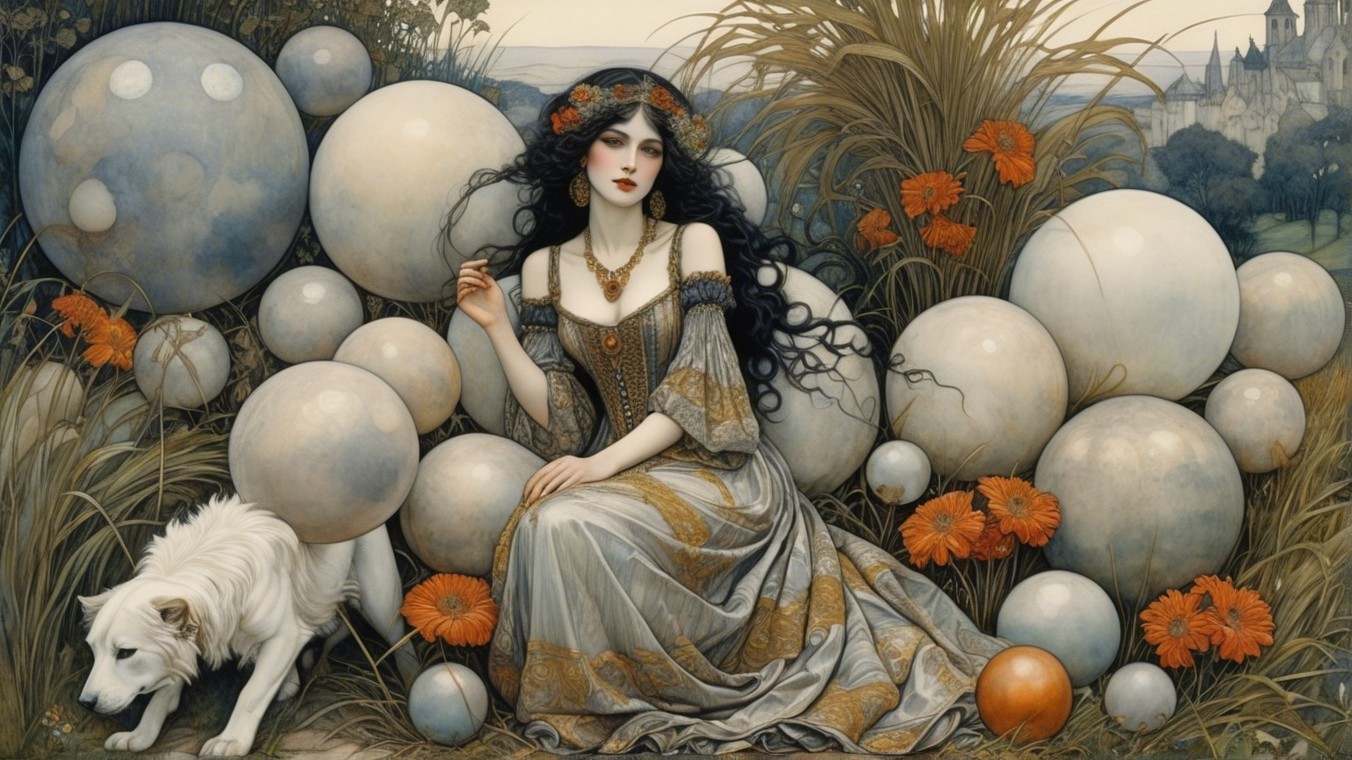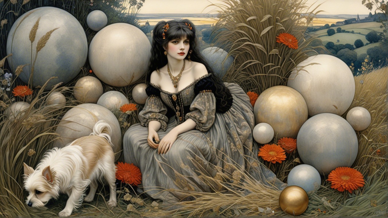 A young woman with long, dark hair adorned with flowers lies in a grassy field alongside two Yorkshire Terriers. A full moon glows in the background, surrounded by a serene landscape.