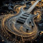 A beautifully crafted guitar with intricate, swirled woodwork is adorned with delicate fairy lights, creating a warm, enchanting ambiance that evokes a sense of artistry and music.