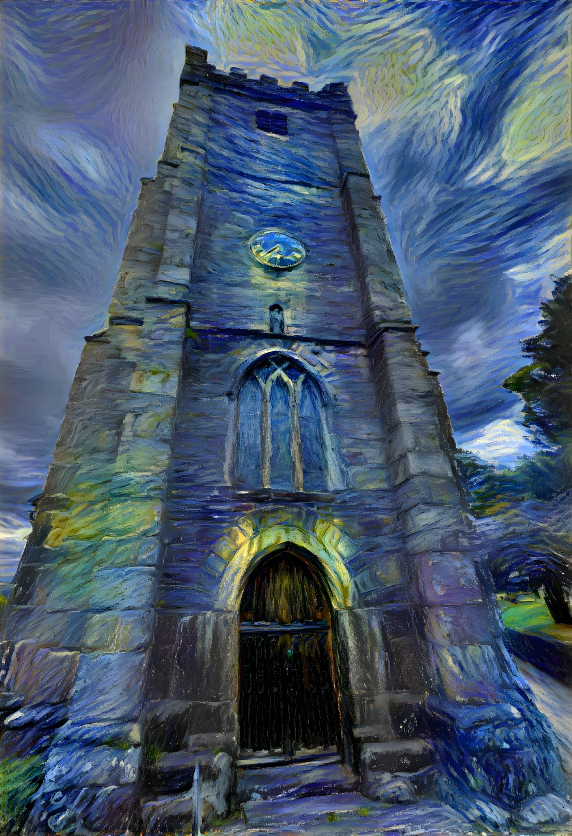 The image features a tall, historic church tower with a clock, set against a swirling sky. Its stone façade is textured and weathered, exuding an aura of timelessness and serenity.