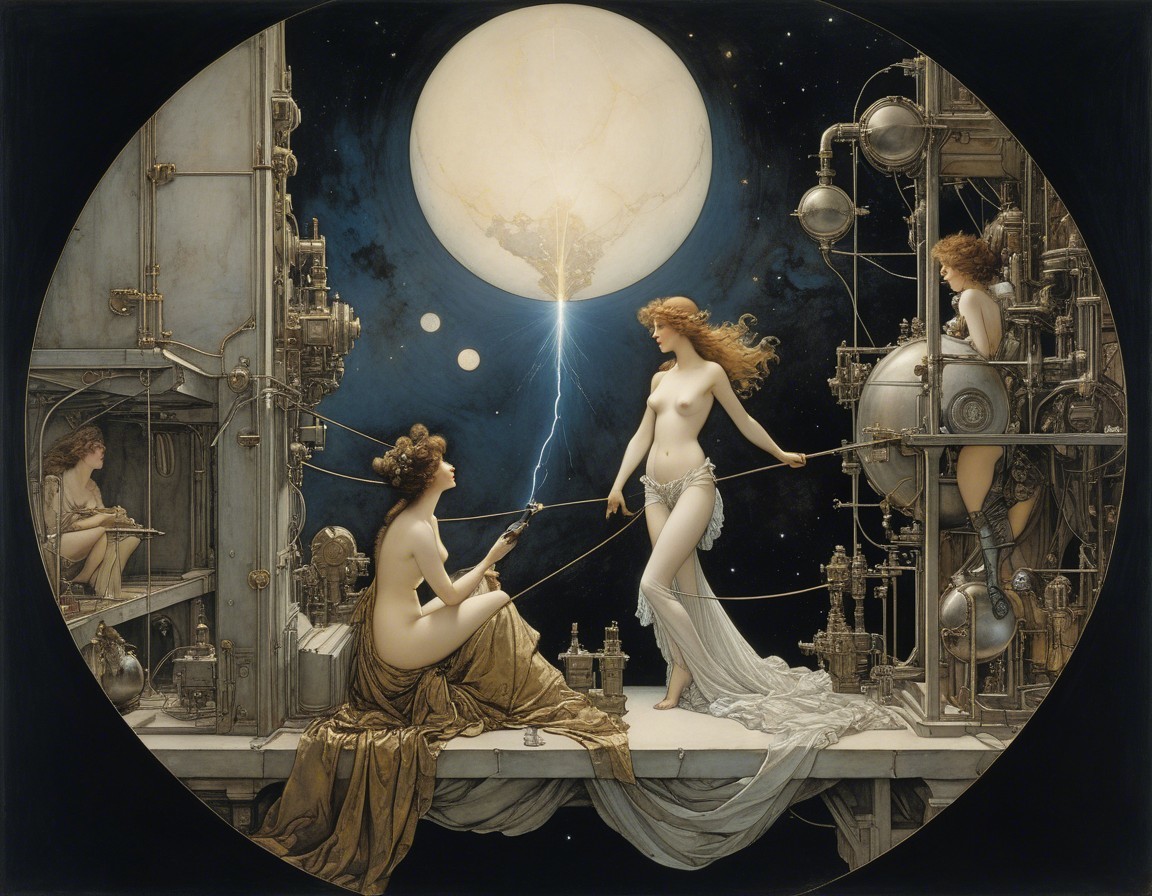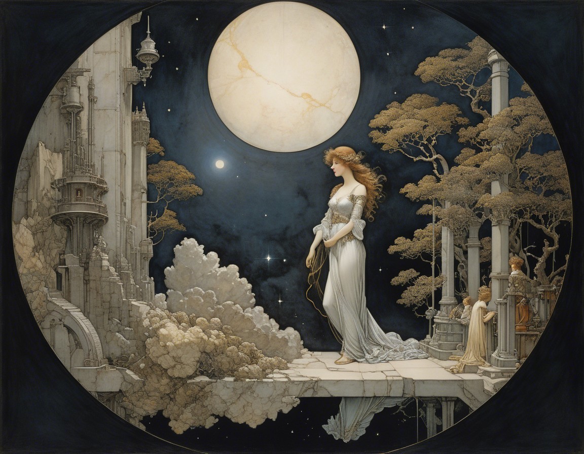 The artwork depicts a surreal scene of a nude figure standing before a bright moon, surrounded by elegantly draped women and celestial-themed architectural elements, blending fantasy and elegance.