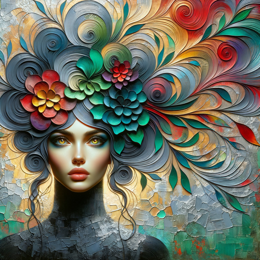 A vibrant digital artwork of a woman with a colorful, floral hairstyle and mesmerizing green eyes.