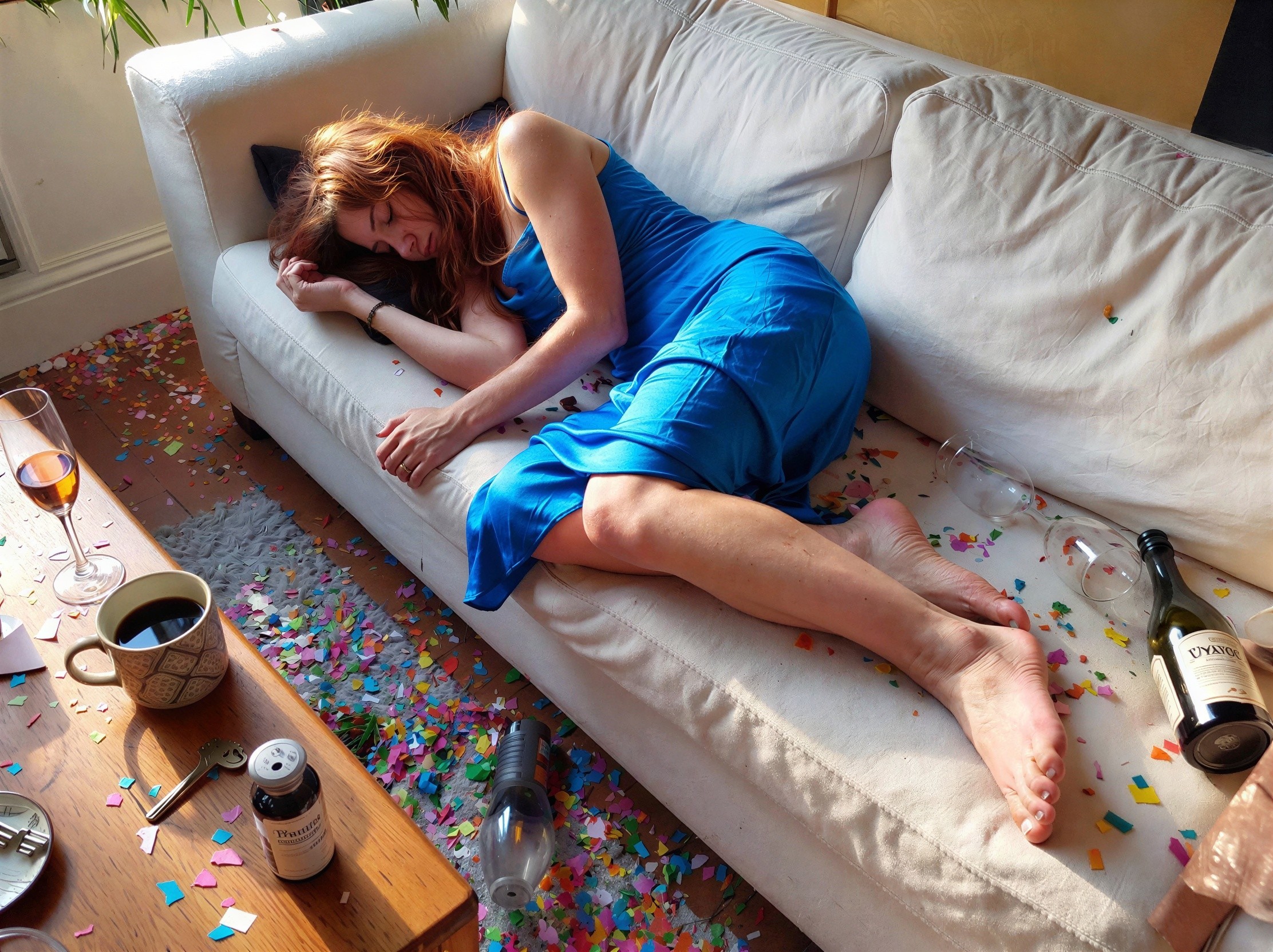 A high-angle indoor shot capturing a red-haired woman sleeping on a sofa amidst colorful confetti on the floor and various aftermath of a party. The woman, with her head nestled in a pillow, has medium-length red hair, and is wearing a blue slip dress. Her hands are relaxed on