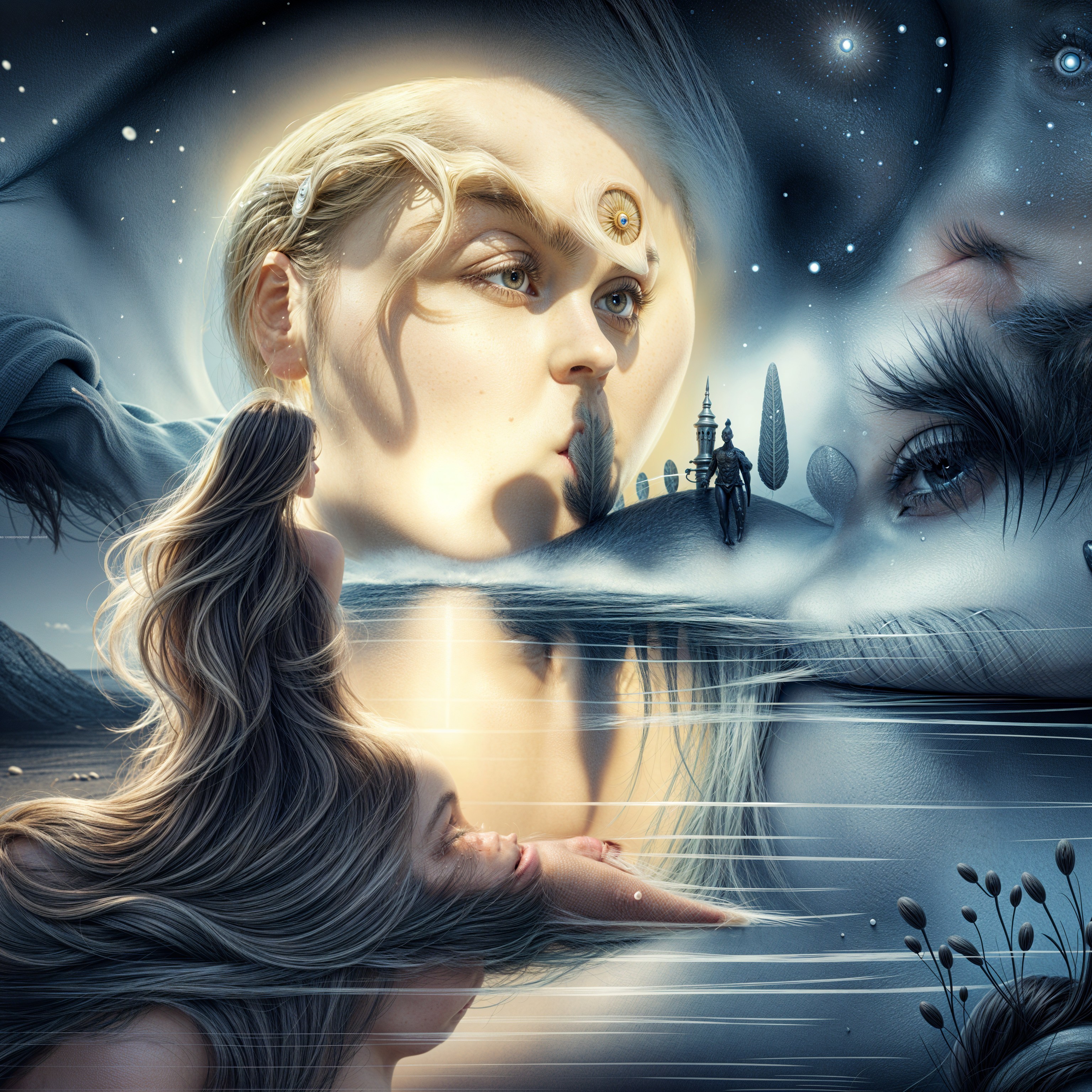 Surreal artwork of a woman's face divided into day and night themes, with celestial elements, a horse, and trees.