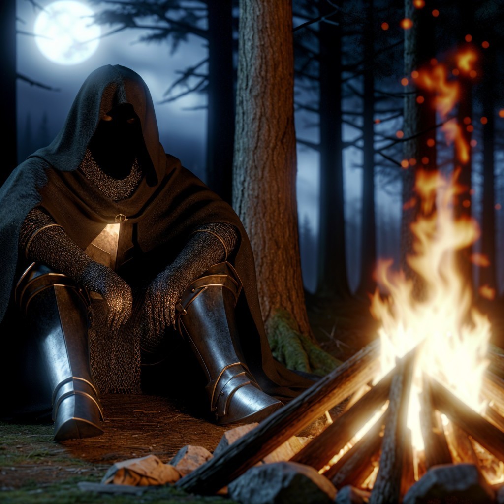 A cloaked figure sits by a crackling campfire in a dark forest, illuminated by the moonlight. The atmosphere is mysterious, emphasizing shadows among towering trees.