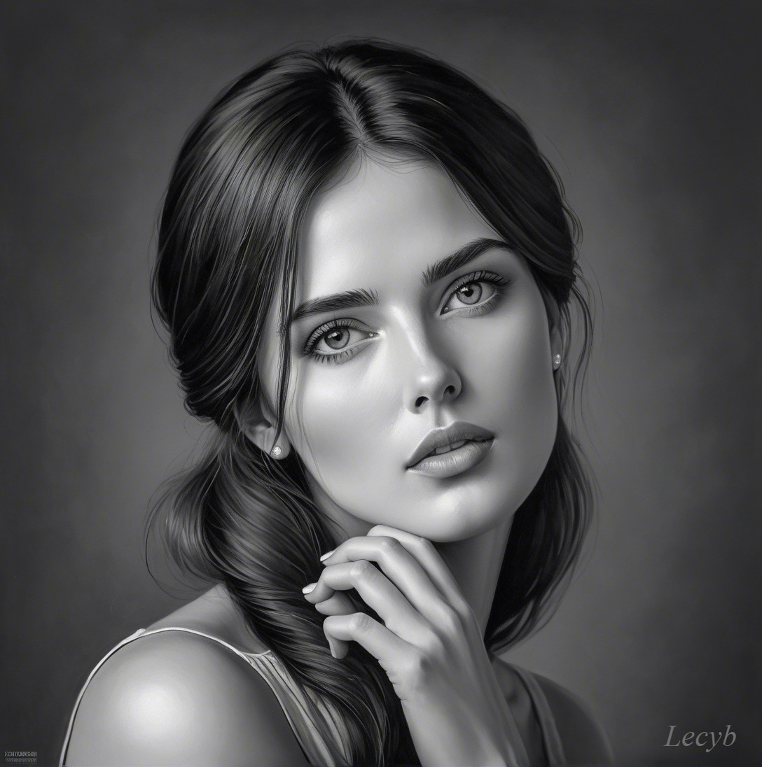 A striking monochromatic portrait of a young woman, featuring soft features and expressive eyes. Her hair is elegantly styled, and she gazes thoughtfully, holding her chin delicately.
