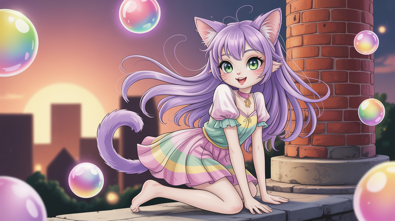 A whimsical scene unfolds as a charming catgirl with enchanting features playfully lounges by a towering smokestack. Her vibrant attire and playful demeanor bring a touch of magic to the industrial backdrop.
