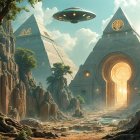 A mystical landscape features a grand pyramid in the background, flanked by lush greenery. A glowing, swirling portal with an eye design dominates the scene, inviting exploration down a stony path.