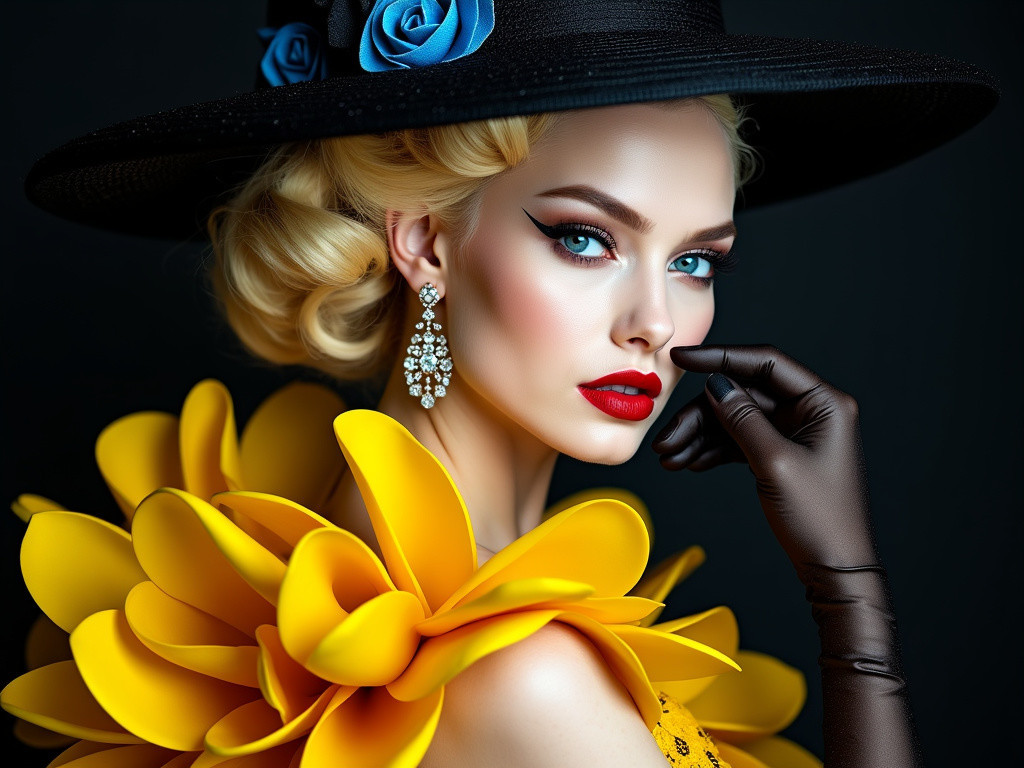 A striking female figure with alabaster skin, bold makeup, and captivating blue eyes, adorned in a yellow floral gown and black hat against a jet-black background exudes luxurious sophistication and vintage allure.