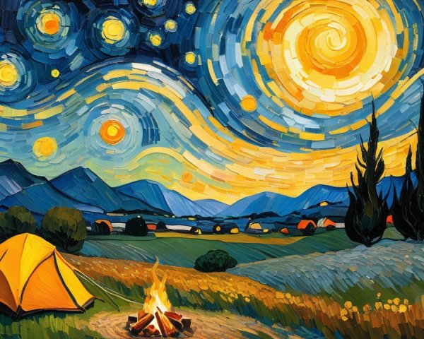This vibrant painting features swirling skies filled with stars and a bright moon, overlooking a serene village with rolling hills, cypress trees, and colorful fields of flowers, showcasing Van Gogh’s signature brushwork.