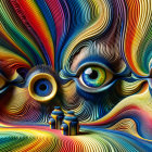 This vibrant, abstract image features a kaleidoscope of swirling colors and patterns, prominently displaying multiple eyes in the center, surrounded by intricate floral and cosmic designs.