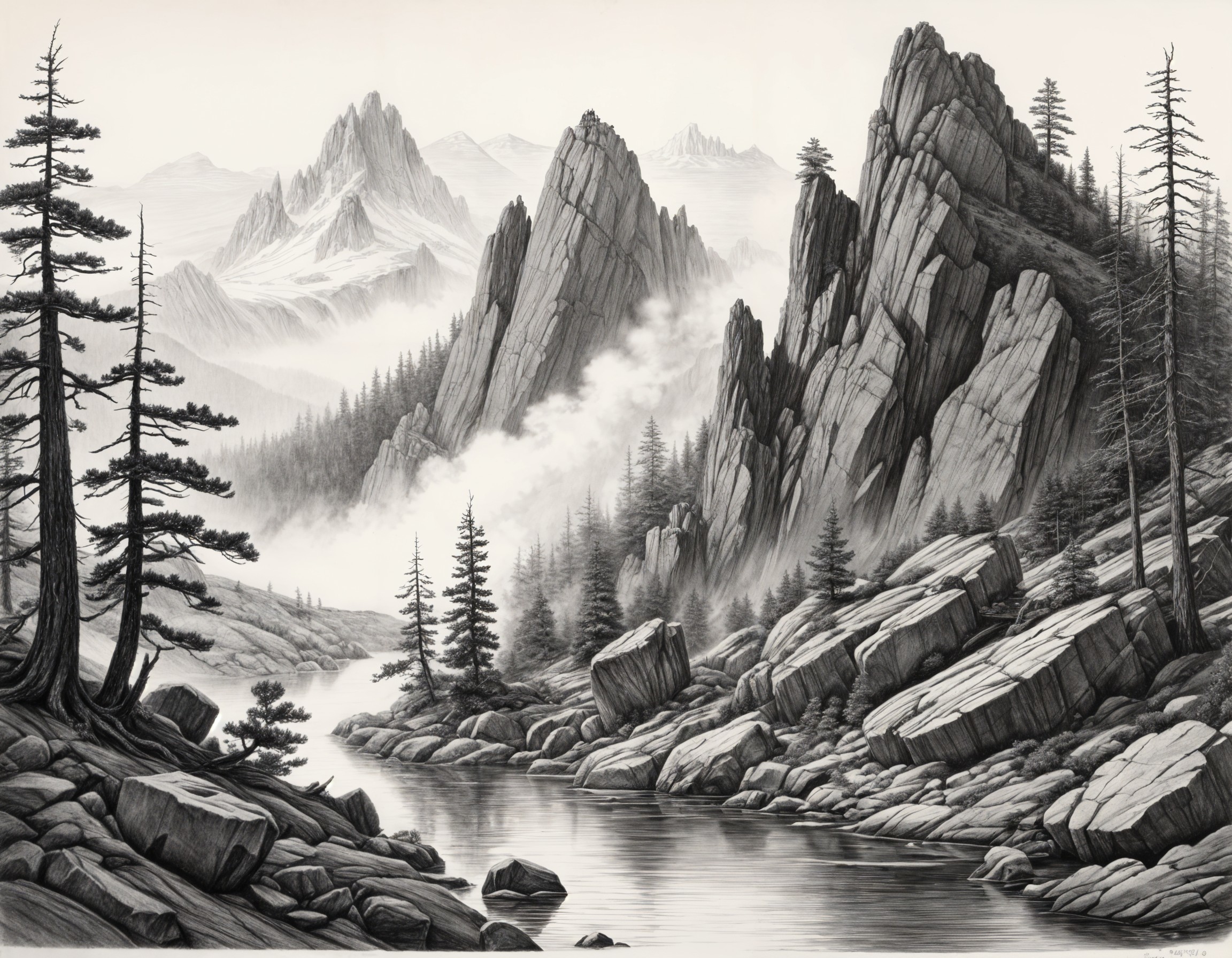 The image depicts a serene mountainous landscape, featuring towering rocky peaks and dense evergreens, with a calm river flowing through the scene, shrouded in gentle mist.