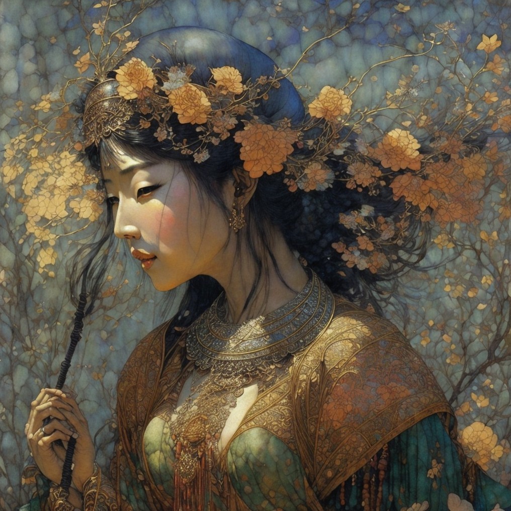 A painting of a woman in traditional attire holding an incense stick, with detailed headpieces, against a backdrop of ancient buildings.