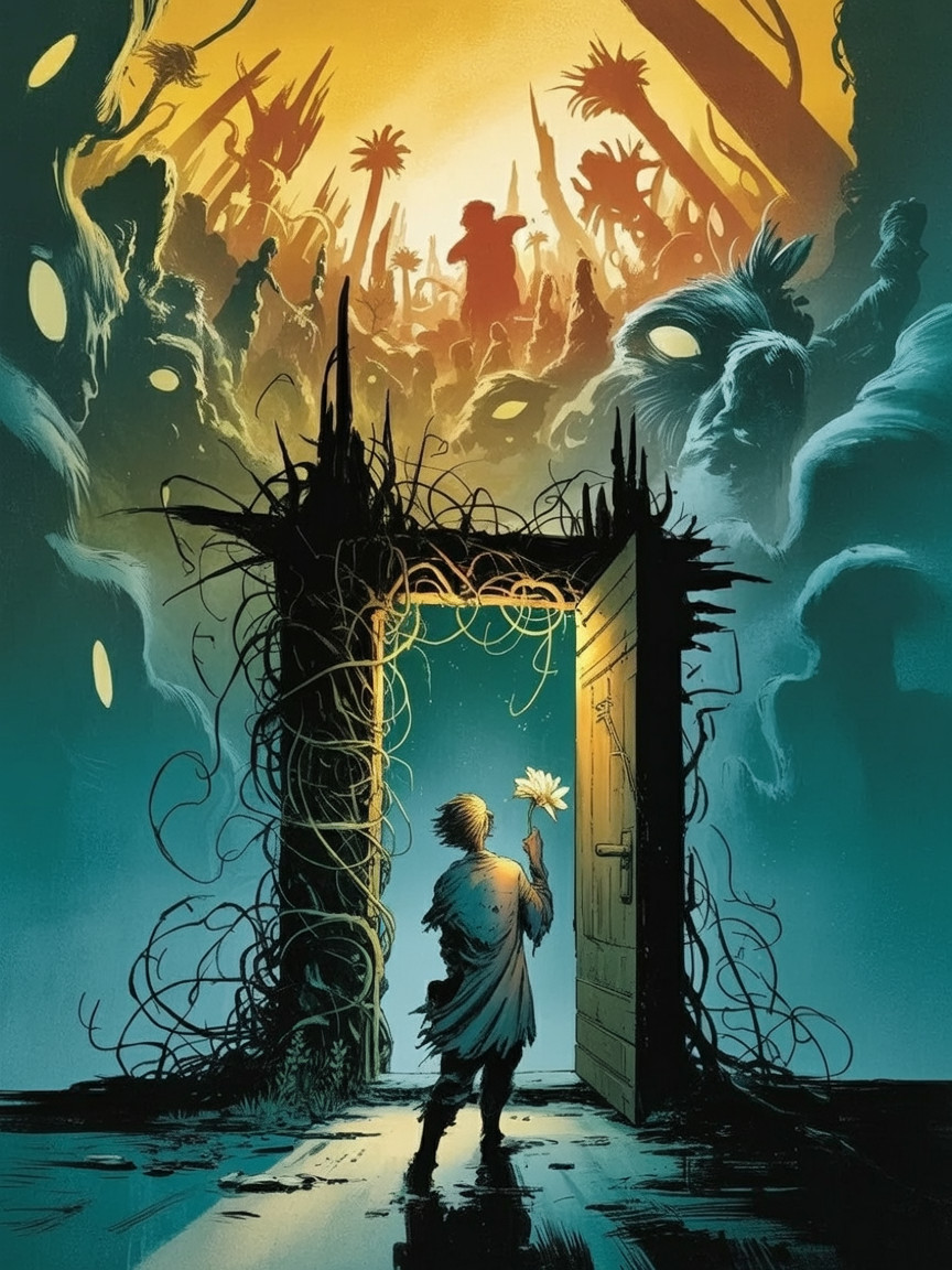 A figure stands before an open door, holding a glowing light. Behind them, a surreal landscape of shadowy figures and ethereal towers looms, merging darkness with vibrant illumination.