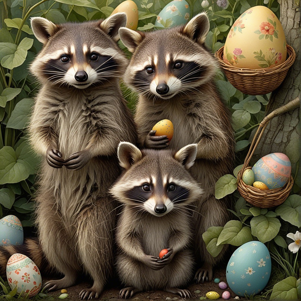 + Prompt:Close up, impish mischievous gorgeous delicate family Easter raccoons with easter eggs in a garden, in the style of Alexander Jansson. by Catrin Welz-Stein, Michael Parkes. By Aubrey Beardsley and Arthur Rackham . .