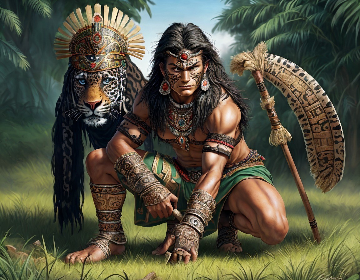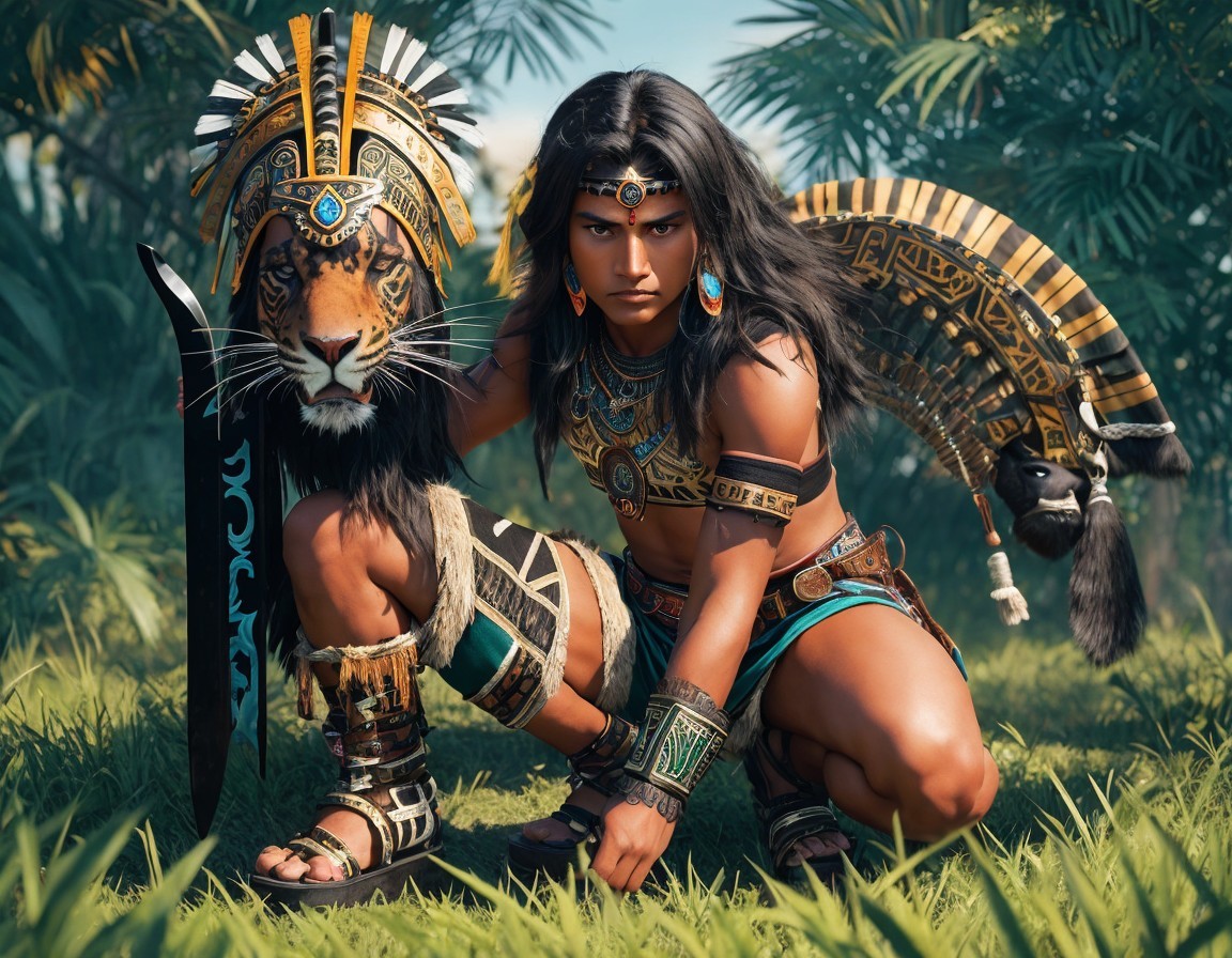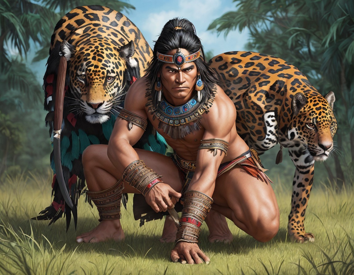 A warrior in tribal armor kneels beside two jaguars in a lush jungle, exuding a sense of strength and unity with nature.