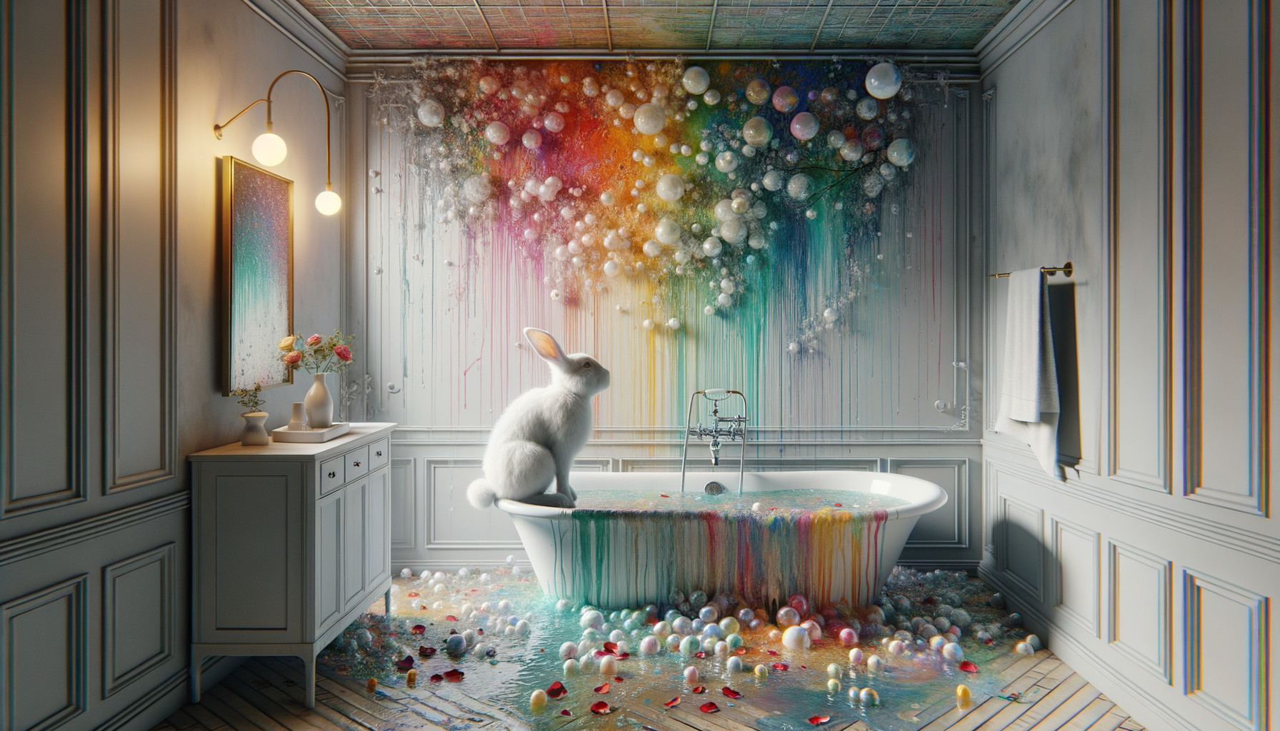 a colorful, overflowing tub in a whimsical bathroom with vibrant paint drips and scattered balls.