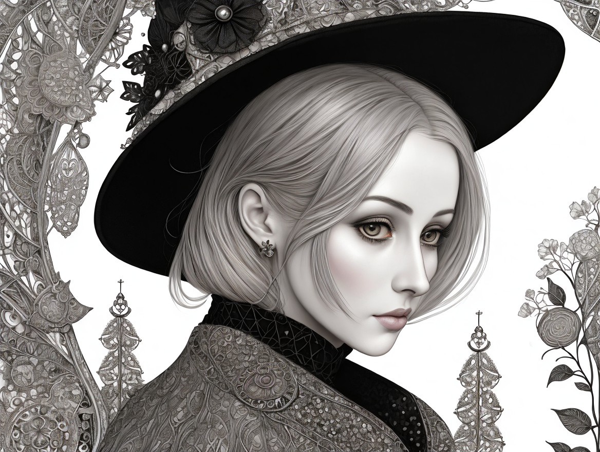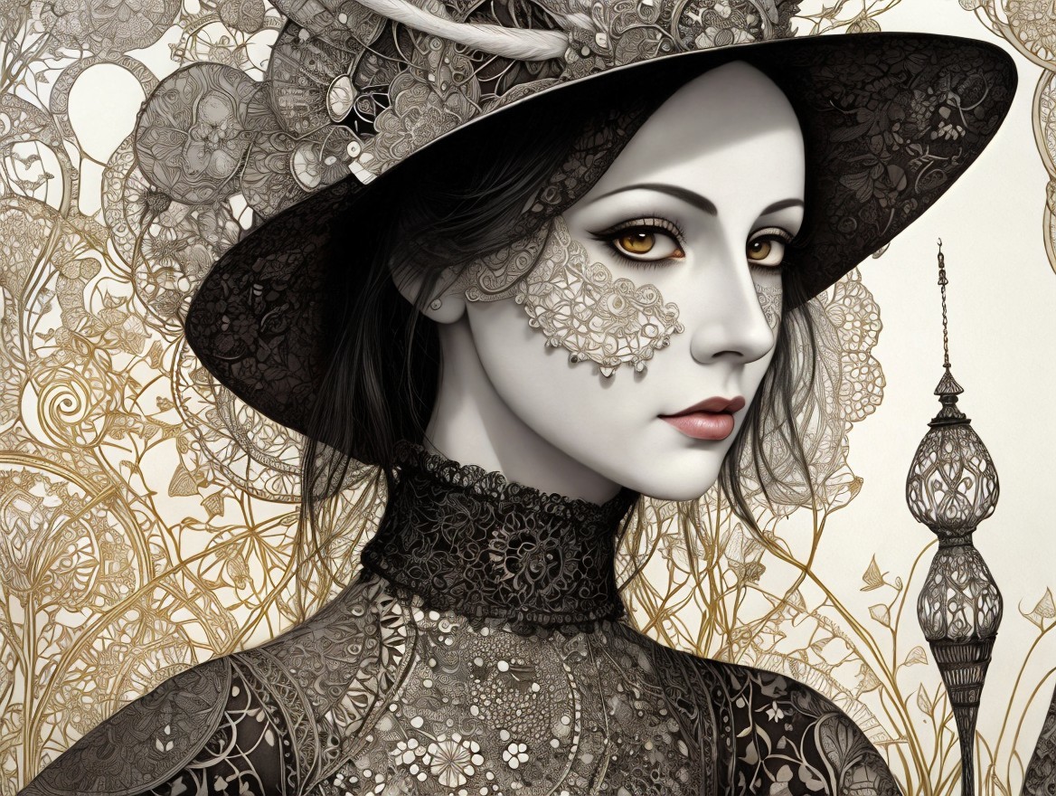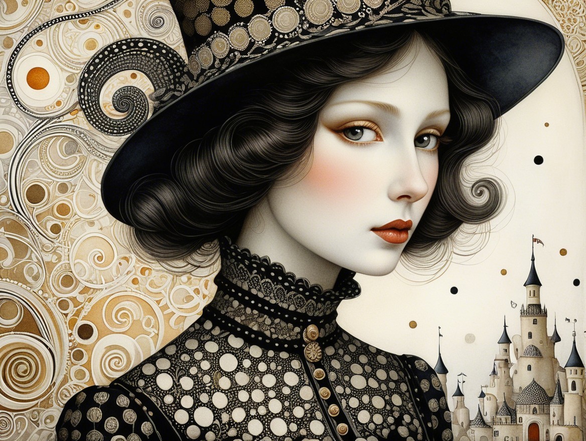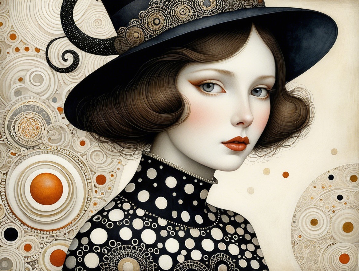 The image features a stylish woman with elegant features, wearing a black and white polka dot outfit and a striped hat. The background includes intricate swirling patterns, enhancing her allure.