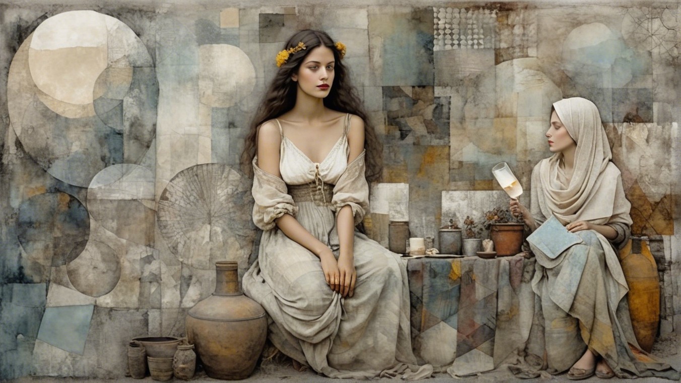 Patchwork fading tones of melancholy vintage summer nostalgia, soul search in portrait in ochre, patina of wine stains, mercury glass. Light and gossamer haze. art brut, moody, somber, desaturated colors, in the style of Paul Klee, Arthur Rackham, Banksy Stunning stylized, beautiful woman, intricate zentangle illustration, watercolor and ink painting, meticulous detail with fine pen strokes, intricate patterns, fractals, ochre and indigo, orange colors, Amanda Clark, Catrin Welz-Stein, Zdzisław Beksiński, and Dee Nickerson
