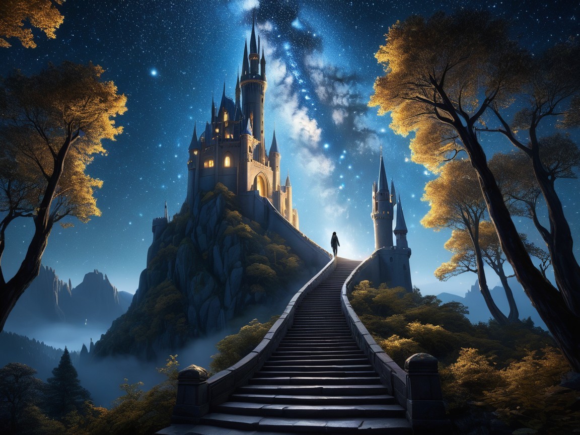 Prompt: "In the heart of the celestial realm, a majestic staircase of glittering stardust and shimmering silver descends from the heavens, where the solitary figure, now a traveler, walks steadily upwards, guided by the gentle light of luminous, glowing trees. At the pinnacle of the staircase, a resplendent castle of crystalline spires and shimmering arches awaits, representing the omniscient knowledge of the universe. God, bathed in an ethereal glow, stands beside the traveler, sharing the secrets of the cosmos as they ascend, surrounded by mythological creatures, such as stardust-infused unicorns and star-beings, moving in harmony. The atmosphere remains tranquil, with an otherworldly silence, as if the universe itself is holding its breath, allowing the traveler to absorb the wisdom."