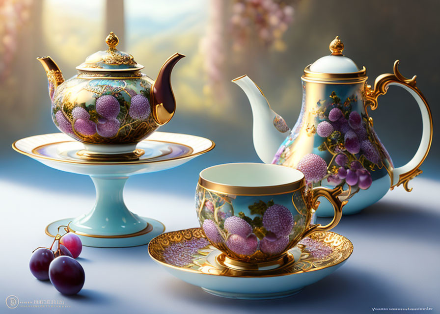 Elegant porcelain teapot and cup set adorned with floral patterns, with a reflection on a glass surface and a purple flower nearby.