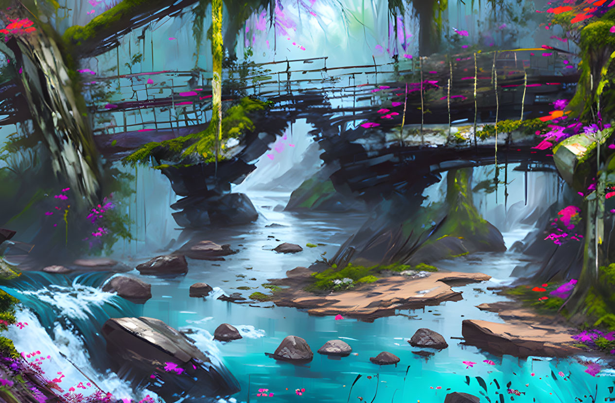 Tranquil stream and old bridge in lush, colorful forest