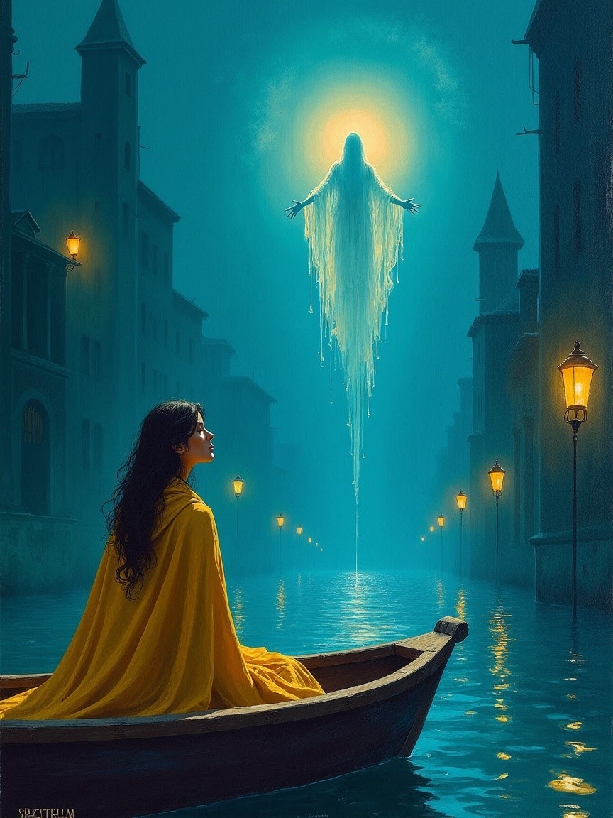 A mystical scene unfolds at night, featuring a cloaked figure in a boat gazing at a glowing, ethereal being rising from the water, surrounded by a serene, enchanted cityscape.