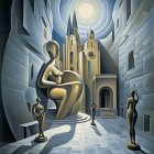 The artwork features a surreal landscape with dramatic contrasts of light and shadow. Abstract forms rise against a luminous backdrop, while figures in suits stand in thoughtful poses.
